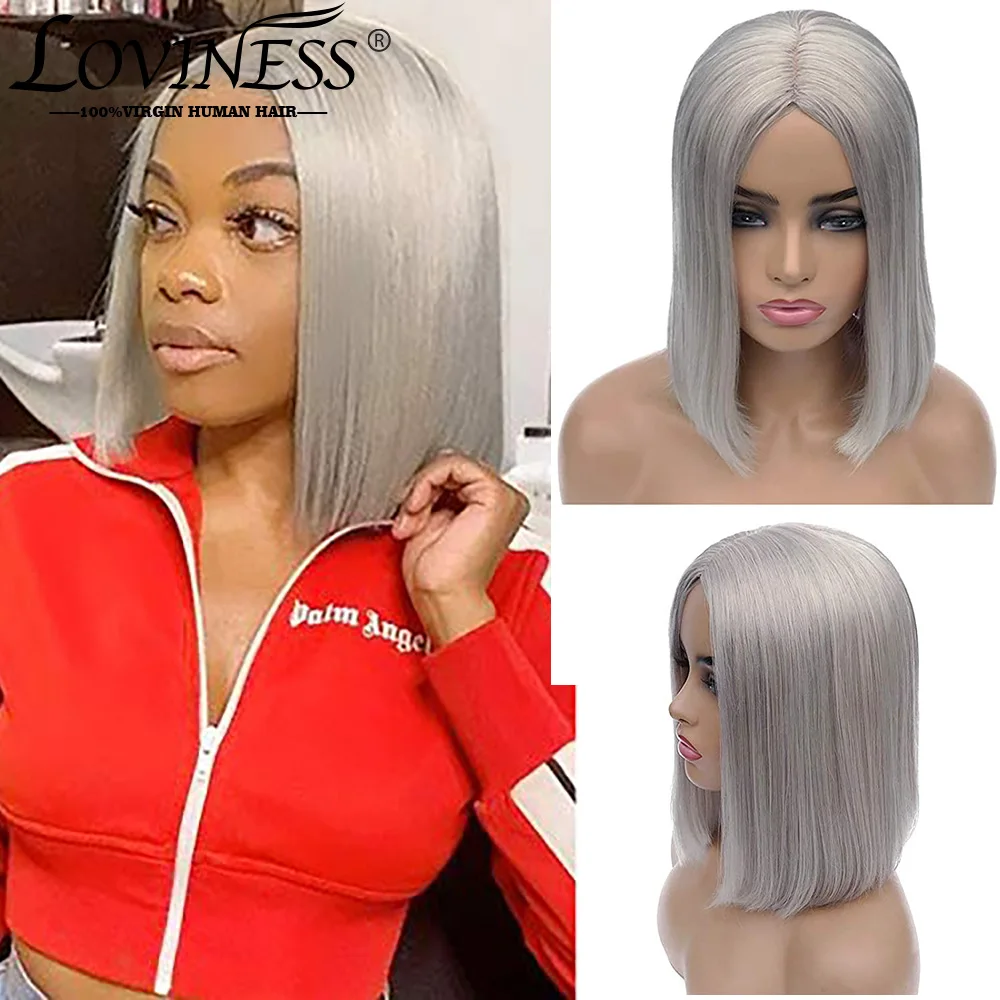 Серый без шнурка передний боб парик 180% Плотность прямой бесклеевой средней части полная машина человеческих волос короткий тупой вырезать боб парики