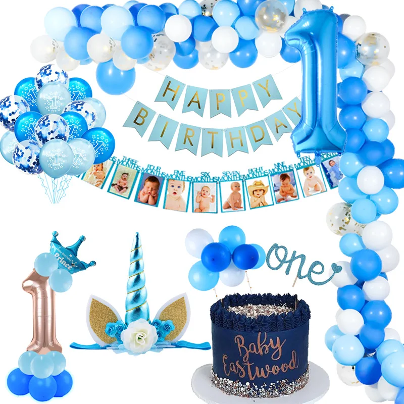 Синий 1st Счастливый малыш душ Мальчики День Рождения Выдвижной Баннер, Флаг Шар гирлянды на 1-й День рождения детей возрастом от 12 месяцев фоторамка во-первых вечерние Декор