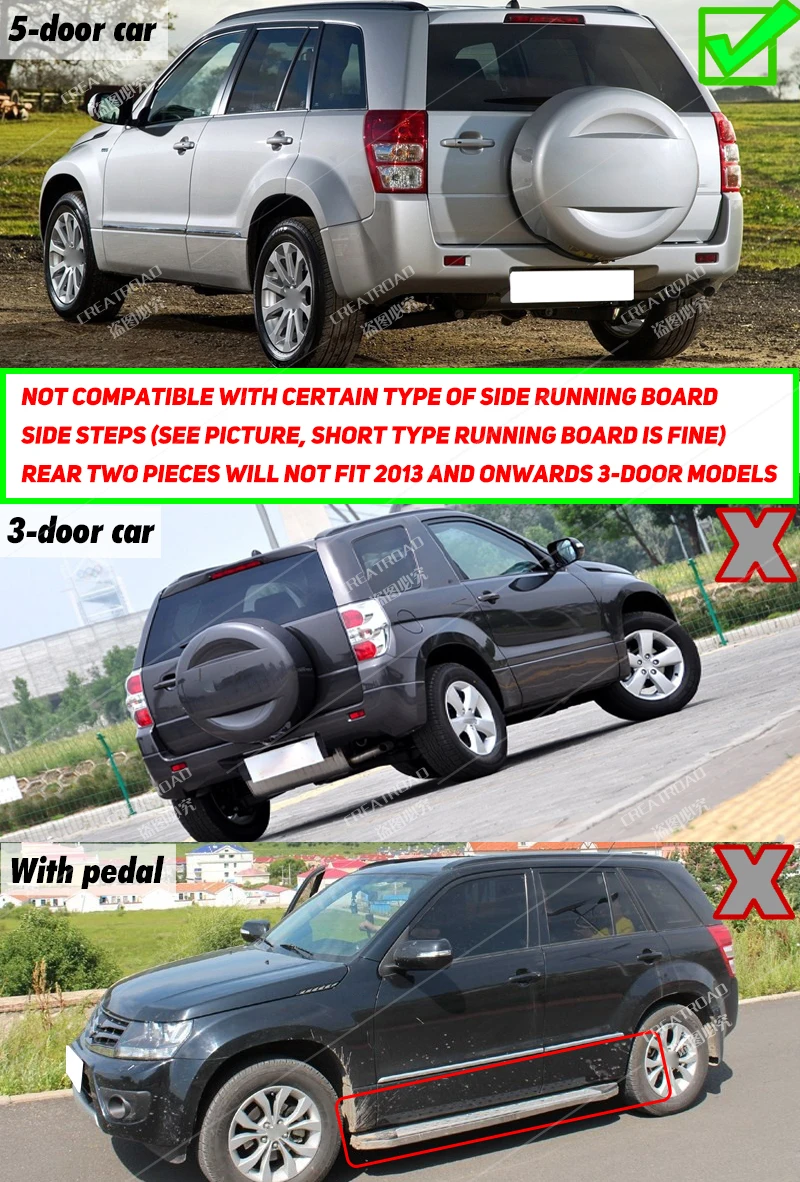 Фитинг: для Suzuki Grand Virata / Escudo (Япония) 2005-2015 (третье поколение, серия JT)Не совместим с определенным типом боковой беговой платы/боковыми шагамиСзади 2 предмета не подойдет 2013 и далее 3-модели входных дверейТолько OEM шасси, не совместимы с модификацией корпуса, боковой облицовкой, комплектами корпусов и т. д.