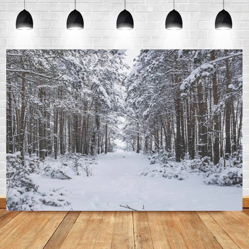 Фон для фотосъемки с изображением зимних белых снежных деревьев леса и солнечного света
