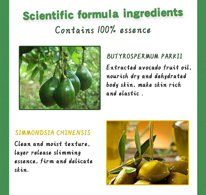 Извлекаемое фруктовое масло авокадо, питает сухую и обезвоженную кожу тела, делает кожу богатой и упругой; Чистая и влажная текстура, слой высвобожает эссенцию для похудения, твердая и нежная кожа, формирует тонкую и нежную изгибу, кожа тела прочная, эластичная, мягкая и нежная, демонстрирует красивый и подвижный внешний вид.