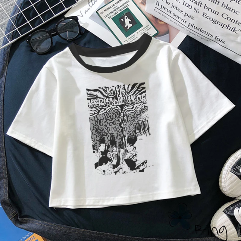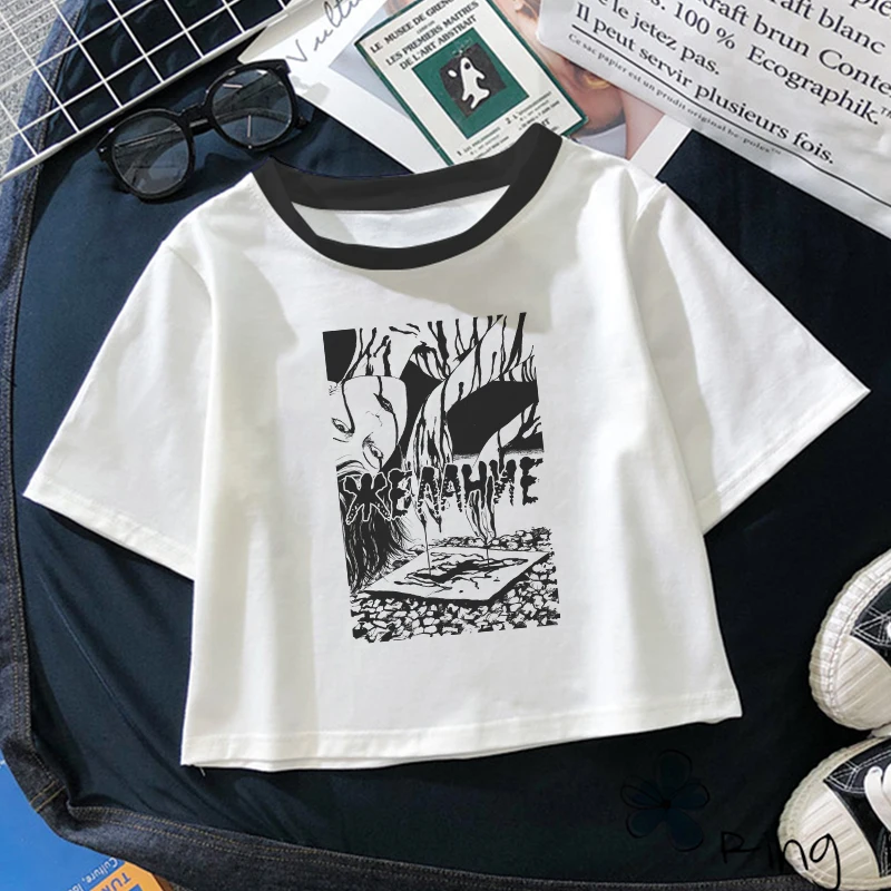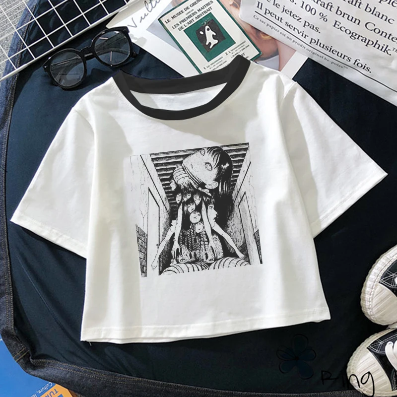 Футболка женская с принтом ужасов, повседневный кроп-топ в стиле Харадзюку улззанг, с японским темным аниме принтом, смешная Готическая Темная футболка, 2021