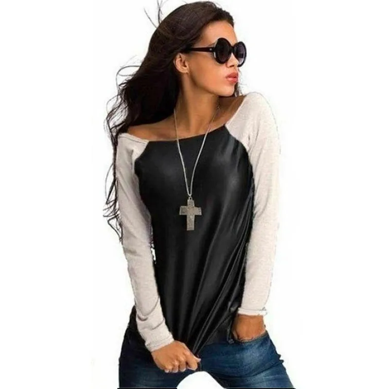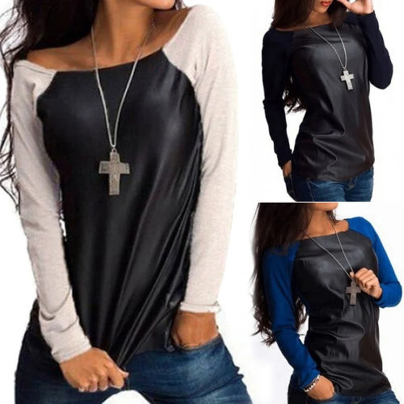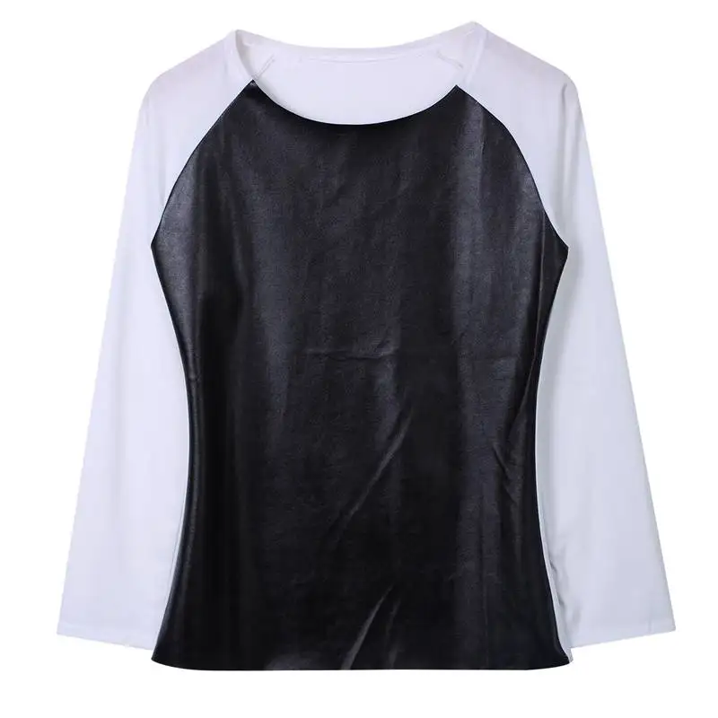Весна 2021, женские футболки с длинным рукавом, повседневный Свободный Топ с круглым вырезом для женщин, кожаная футболка в стиле пэчворк
