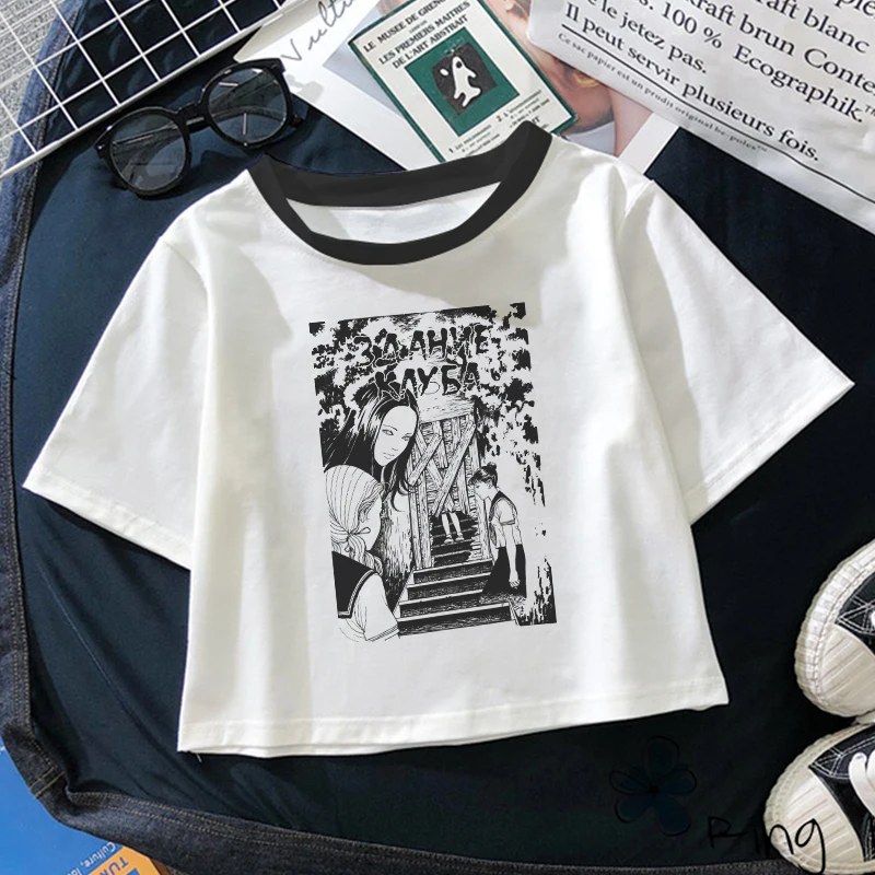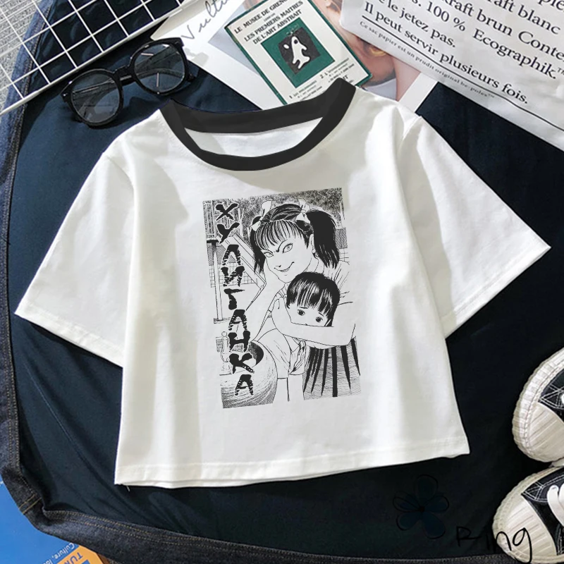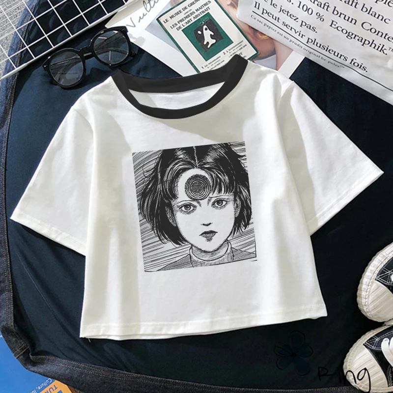 Футболка женская с японским аниме принтом ужасов, пикантный укороче...