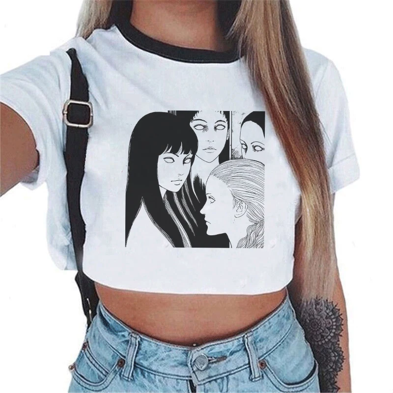 Футболка женская с японским аниме принтом ужасов, пикантный облегающий кроп-топ в стиле Харадзюку, Повседневная забавная уличная одежда в готическом стиле