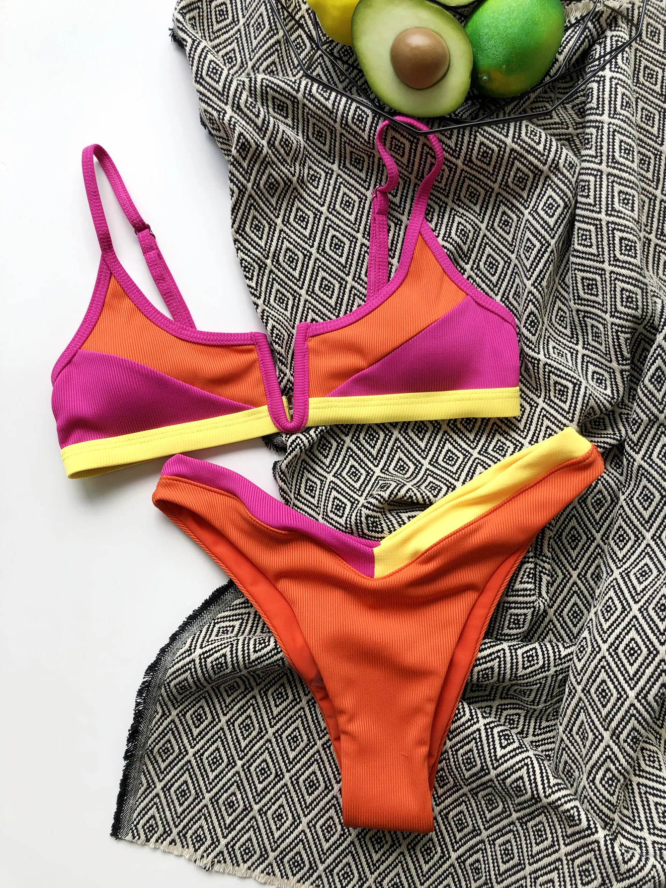Женские купальные костюмы в рубчик 2 шт., бикини с цветными вставка...