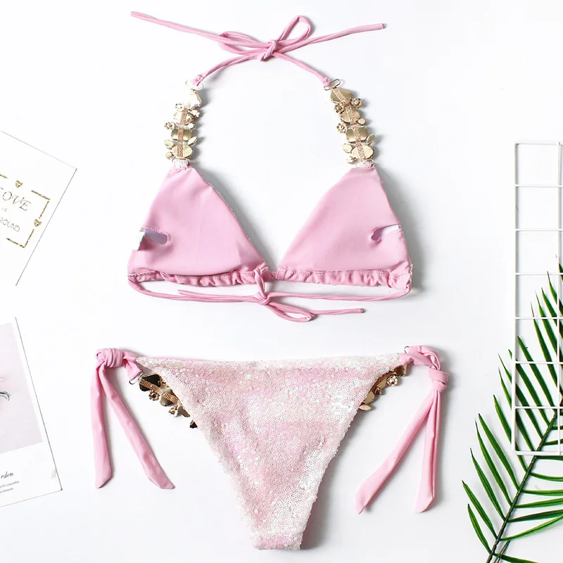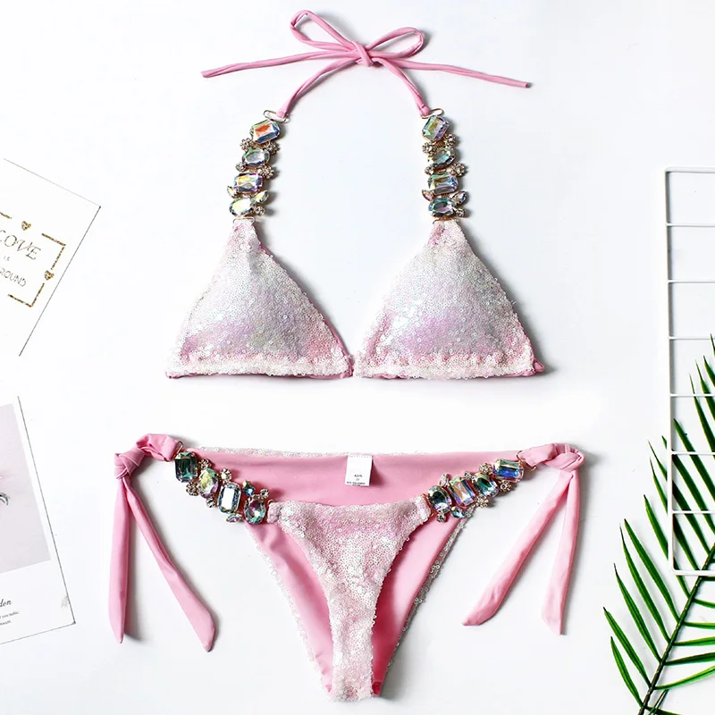 Новинка 2021, блестящие стразы с кристаллами, женский купальник бандо, женский купальник с лямкой через шею, комплект бикини со стразами, купальный костюм с пуш-ап