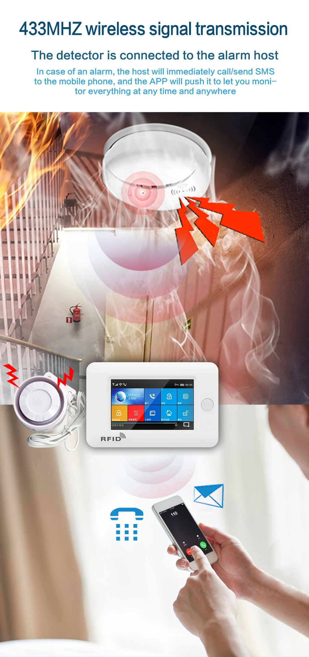 Беспроводной пожарный детектор дыма 433 МГц, датчик для телефона 106 103, Wi-Fi, GSM, для офиса