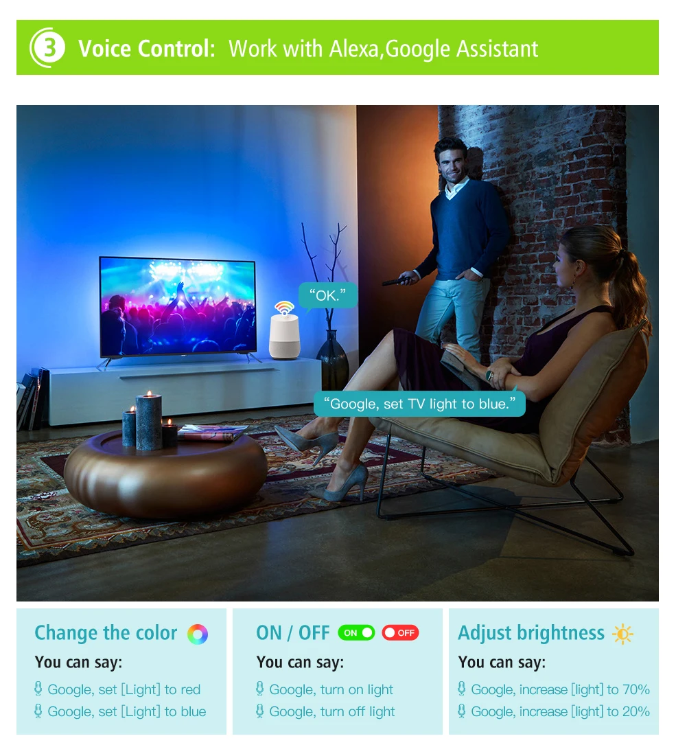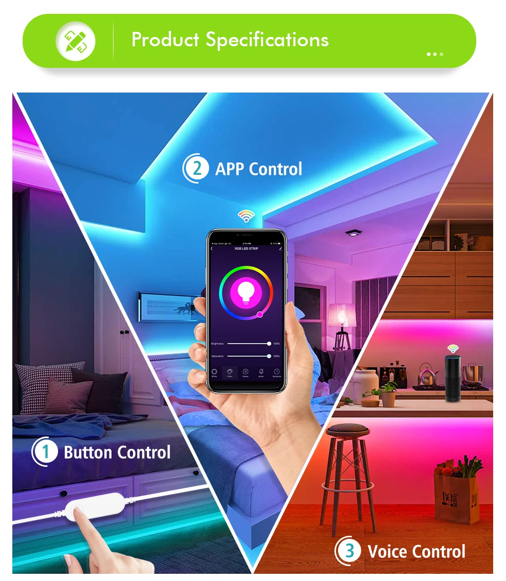 Тип: Wifi usb Светодиодная лентаВодонепроницаемый Тип: IP20 не водонепроницаемыйТип светодиодный: SMD 5050Количество СВЕТОДИОДНЫЙ: 30 светодиодный s/mСветильник Цвет: разноцветный "Красный-зелёный-желтыйУгол луча: 120 градусовНапряжение: 5 В постоянного тока 1A(1 м),5 В 2A(2 м)Температура хранения. : -40 ~ 80 градусов ЦельсияРабочая температура. : -25 ~ 60 градусов Цельсия Светодиодный контроллерНапряжение: 5 В постоянного токаПриложение: Smart LifeПоддержка мобильных устройств: Android/IOSСистема поддержки: Amazon Alexa, Google Assistant,Управление: Голосовое управление/кнопочное управление/пульт дистанционного управления с приложением