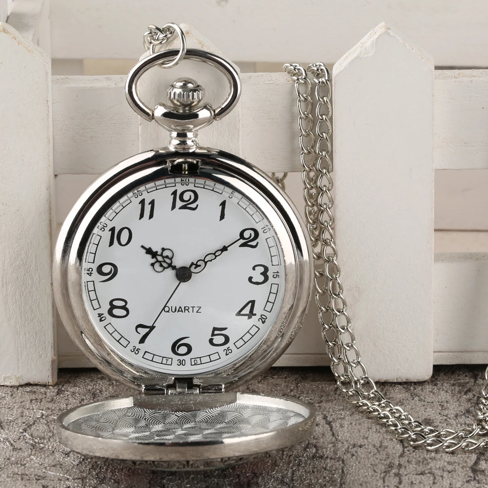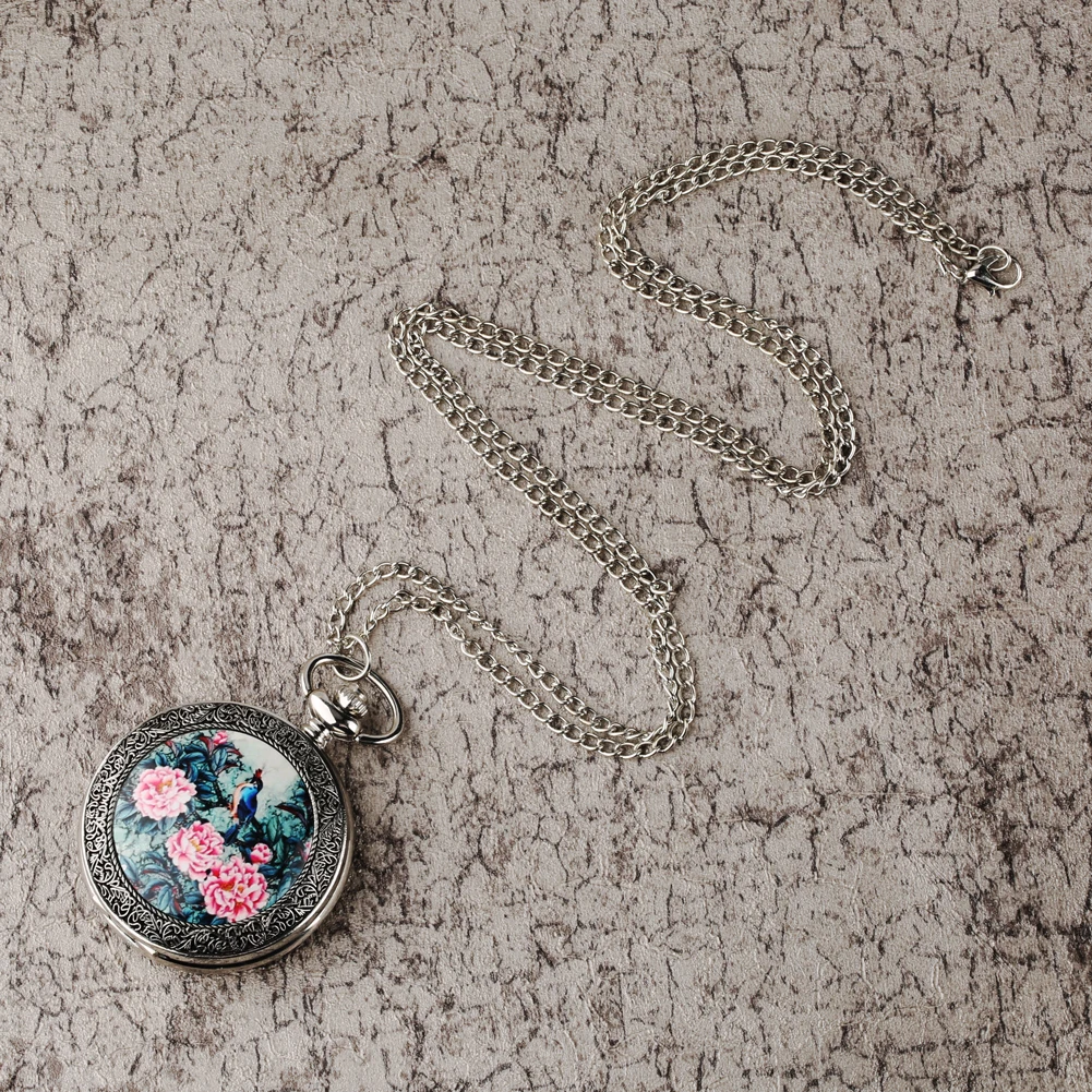 Женские карманные часы, серебристый корпус, тонкая цепочка, кулон, Простой Большой циферблат, птица и 3 цветка, изысканный узор, лучший подарок для жены