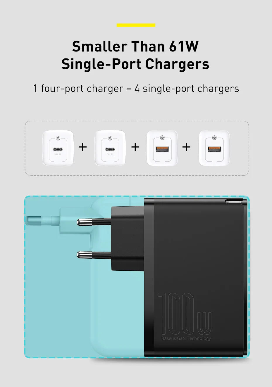 Модернизированное второе поколение GaN materials plus три ядра технологии создают зарядное устройство 100 Вт с четырьмя портами быстрой зарядки при использовании отдельно