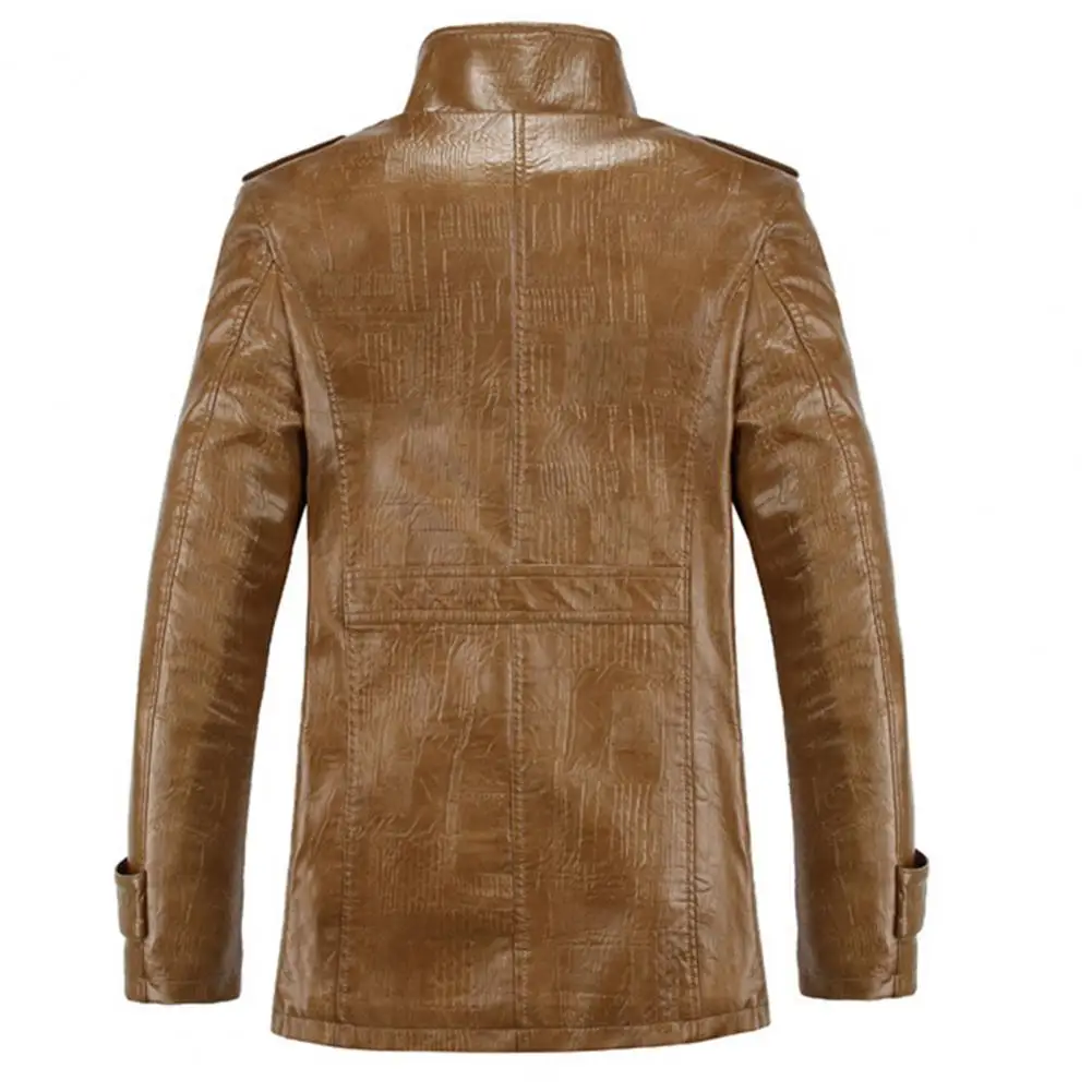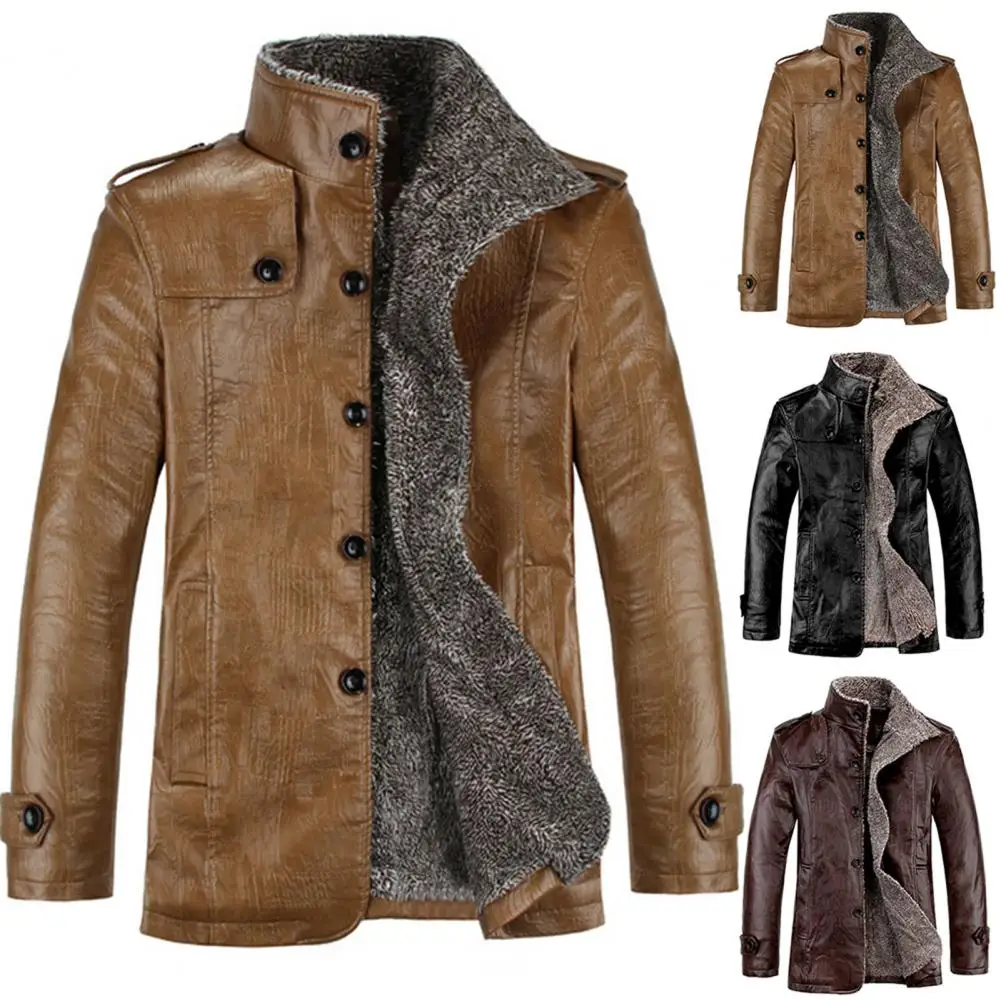 Мужская зимняя куртка с воротником-стойкой и искусственная кожа, на пуговицах, с карманами, флис размера плюс теплая куртка