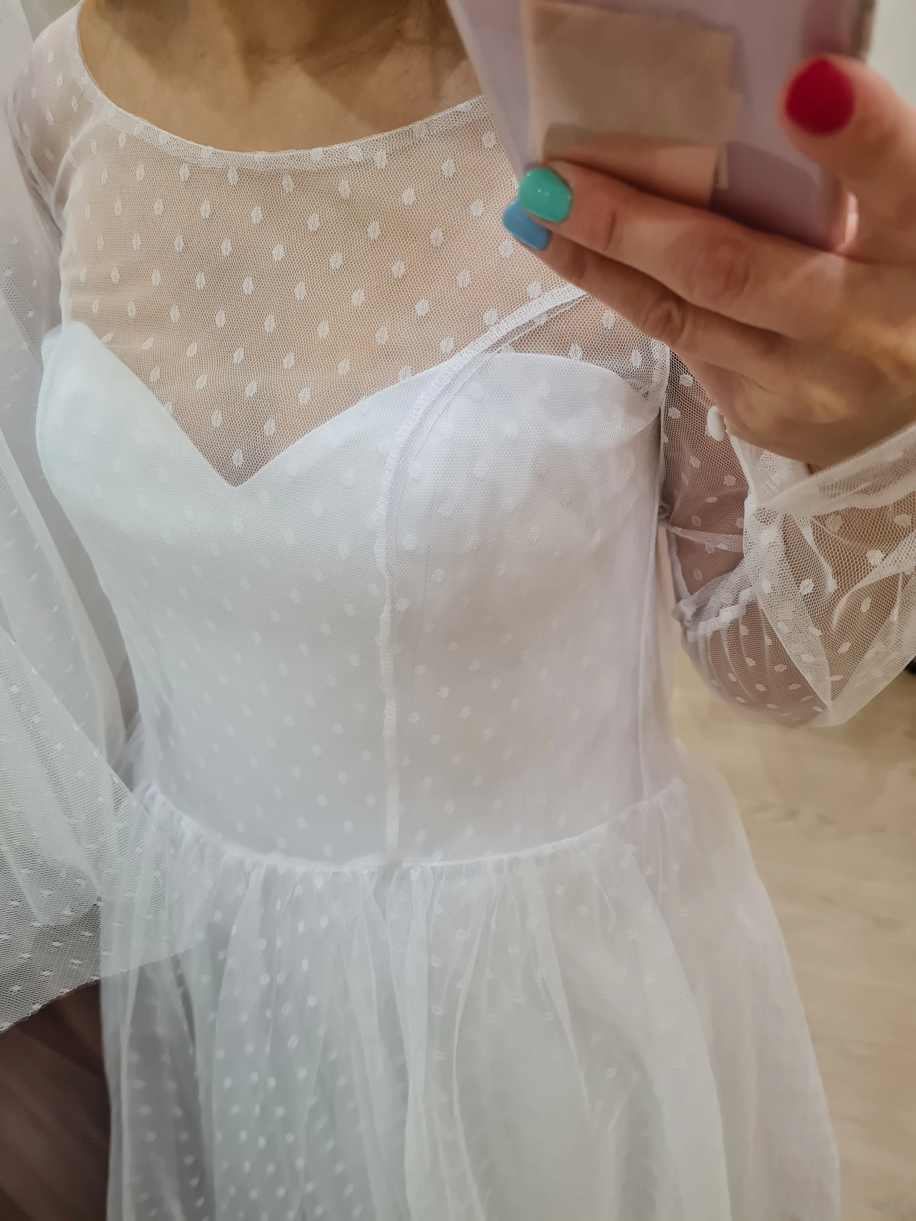 Свадебное платье с рукавами, свадебное платье разрез на юбке а-силуэт
