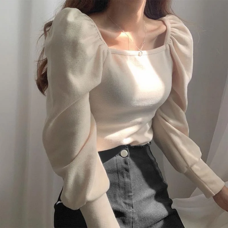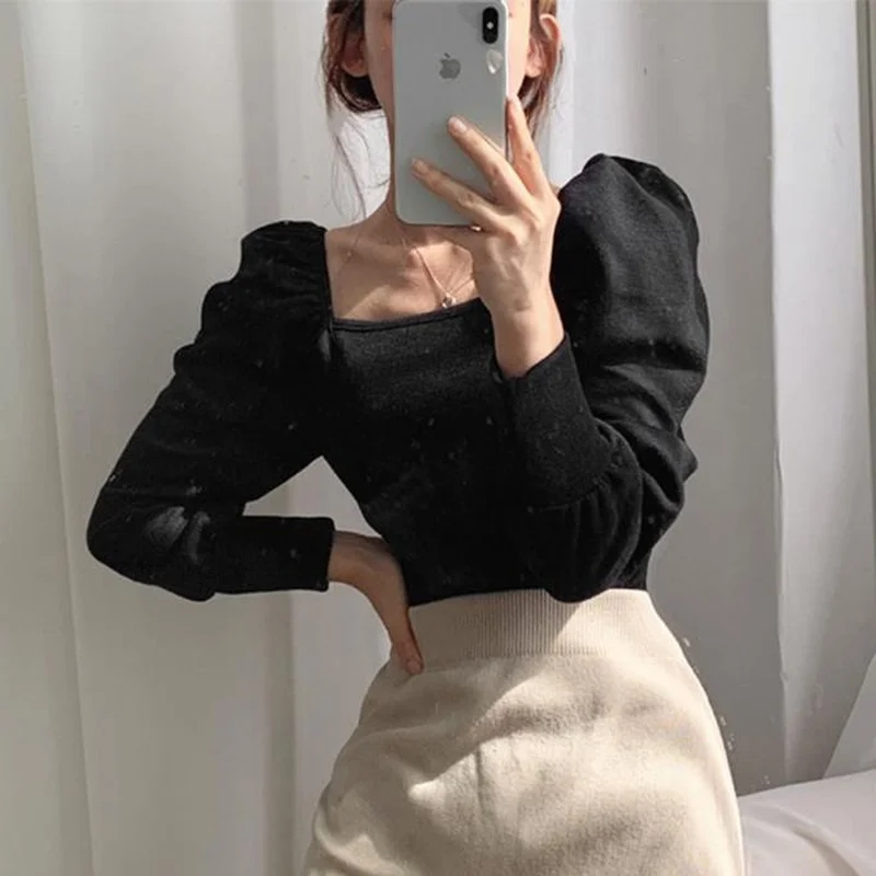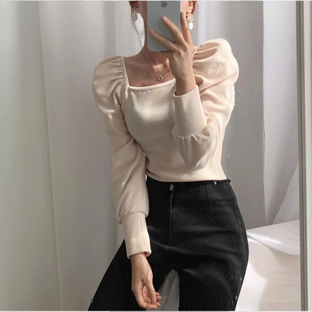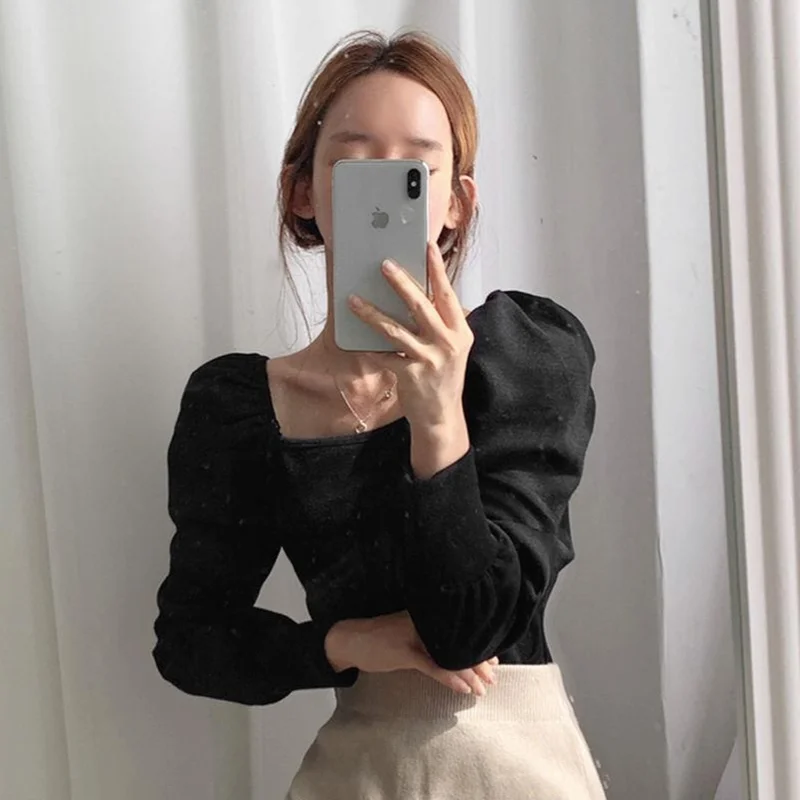 Футболка женская с длинным рукавом, однотонная универсальная приталенная с квадратным вырезом, в Корейском стиле, в стиле Харадзюку, для студенток, весна-осень