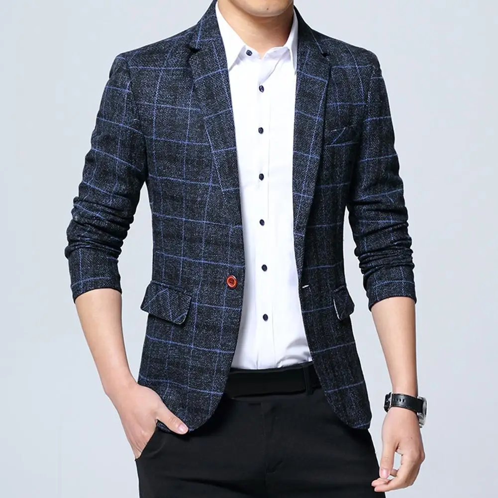 Модный Мужской приталенный Блейзер в клетку с отложным воротником, куртка, пальто на одной пуговице, деловой костюм