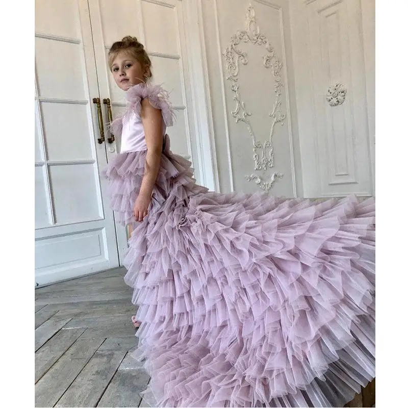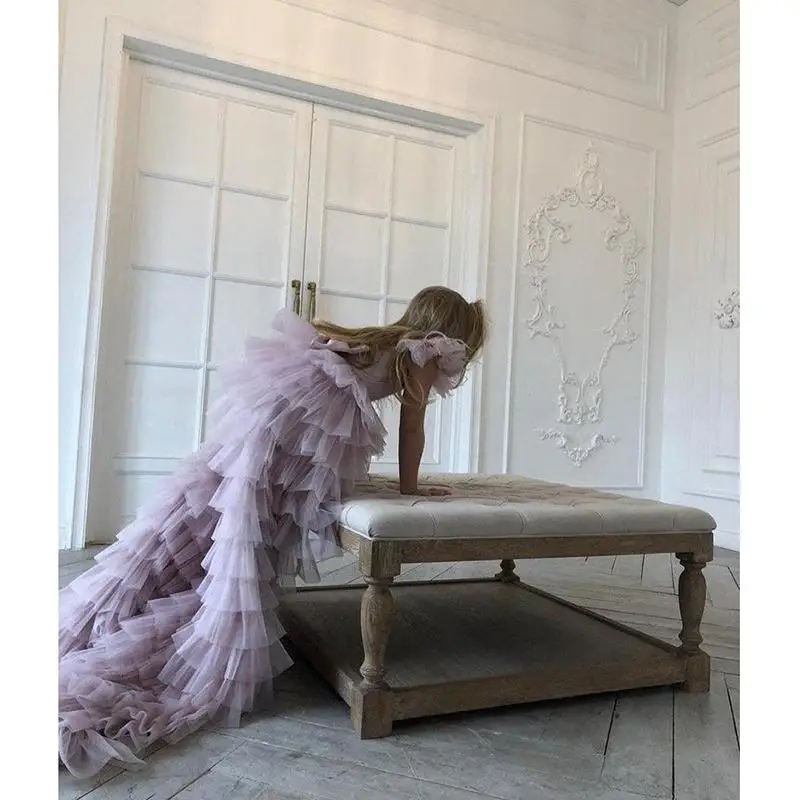 Платье с длинным шлейфом и оборками для девочек; Праздничное детское платье на свадьбу; Многослойное детское платье для фотосессии