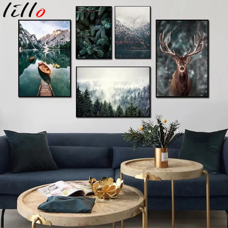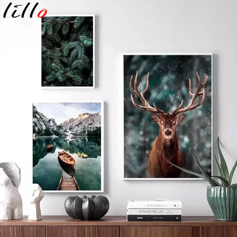 Скандинавский Снежный пейзаж, лес, олень, постер, животные, озеро, лодка, рождественские листья, принты гор, живопись, природа, картина, украшение