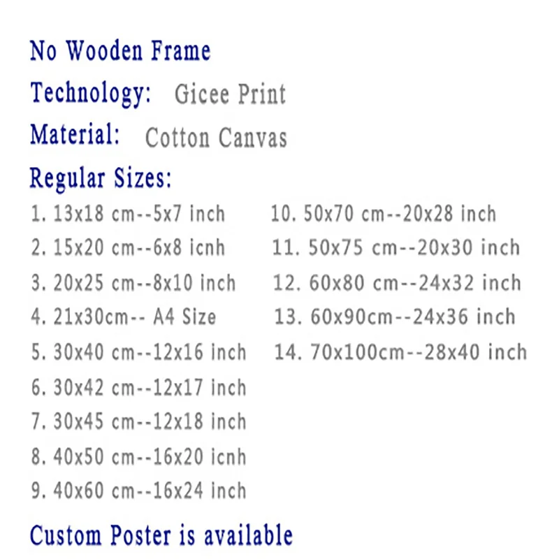 1. Шелк или холст... Шелковый плакат тонкий, он предназначен для внутренней отделки, его нельзя трогать водой; Холст толстый, прочный и водонепроницаемый. 2. Цвет: плакат имеет яркий цвет и не выцветает. Из-за световых эффектов цвет объектов может немного отличаться от изображений. 3. Тип: только постер, деревянная рамка в комплект не входит; 4. Белая граница: изображение не имеет белой границы, общий размер будет такой же, как ваш заказ. Если вам нужна белая граница, пожалуйста, свяжитесь с нами перед размещением заказа. 5. Размер: указан в см. Возможна погрешность в размере 2-3 мм; 6. Индивидуальный плакат: принимаются индивидуальные плакаты с изображениями в высоких пикселях. Идеально подходит для домашнего декора, украшения детской спальни, украшения гостиной, подарка. (Если вы хотите, пожалуйста, свяжитесь с нами.)