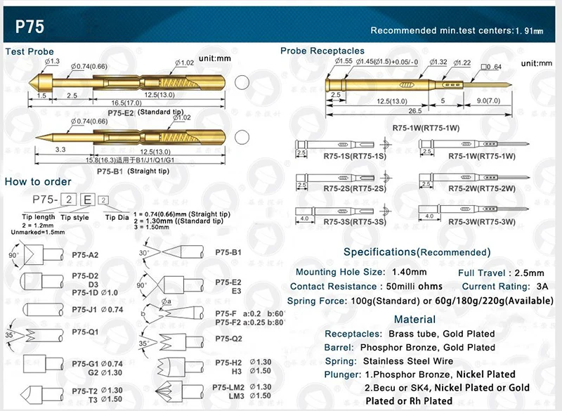 100 шт. R75-2S латунную трубку позолоченная Весна Тесты ProbeDiamet...