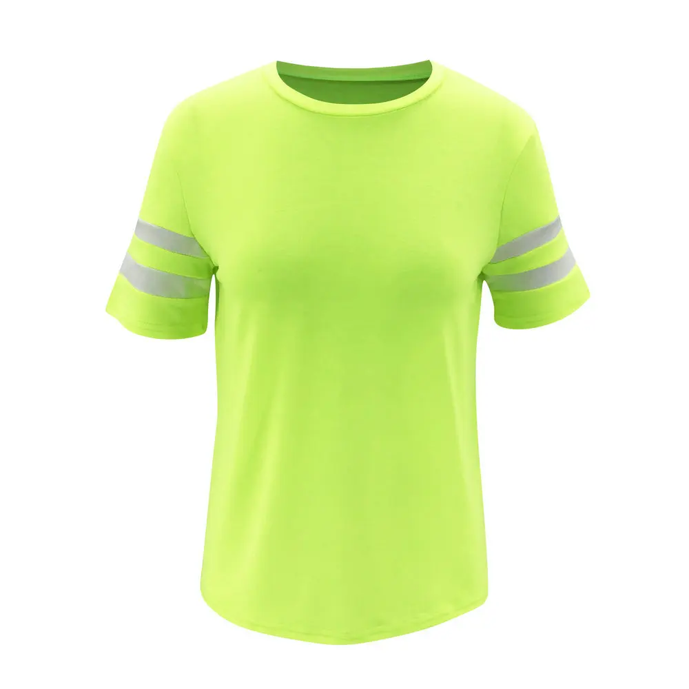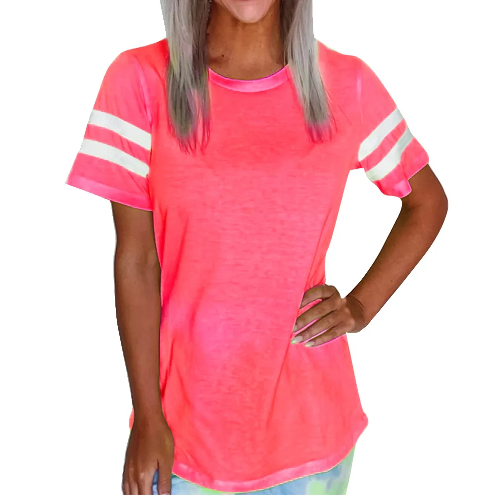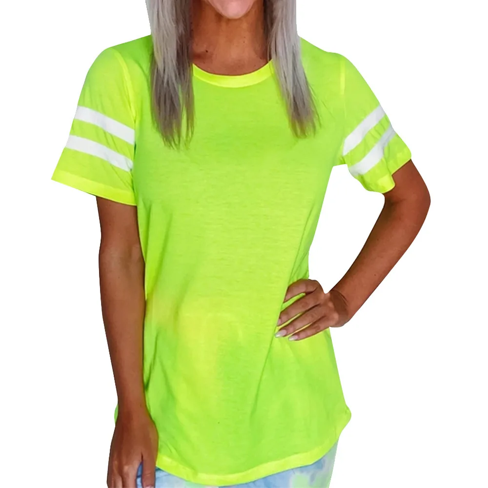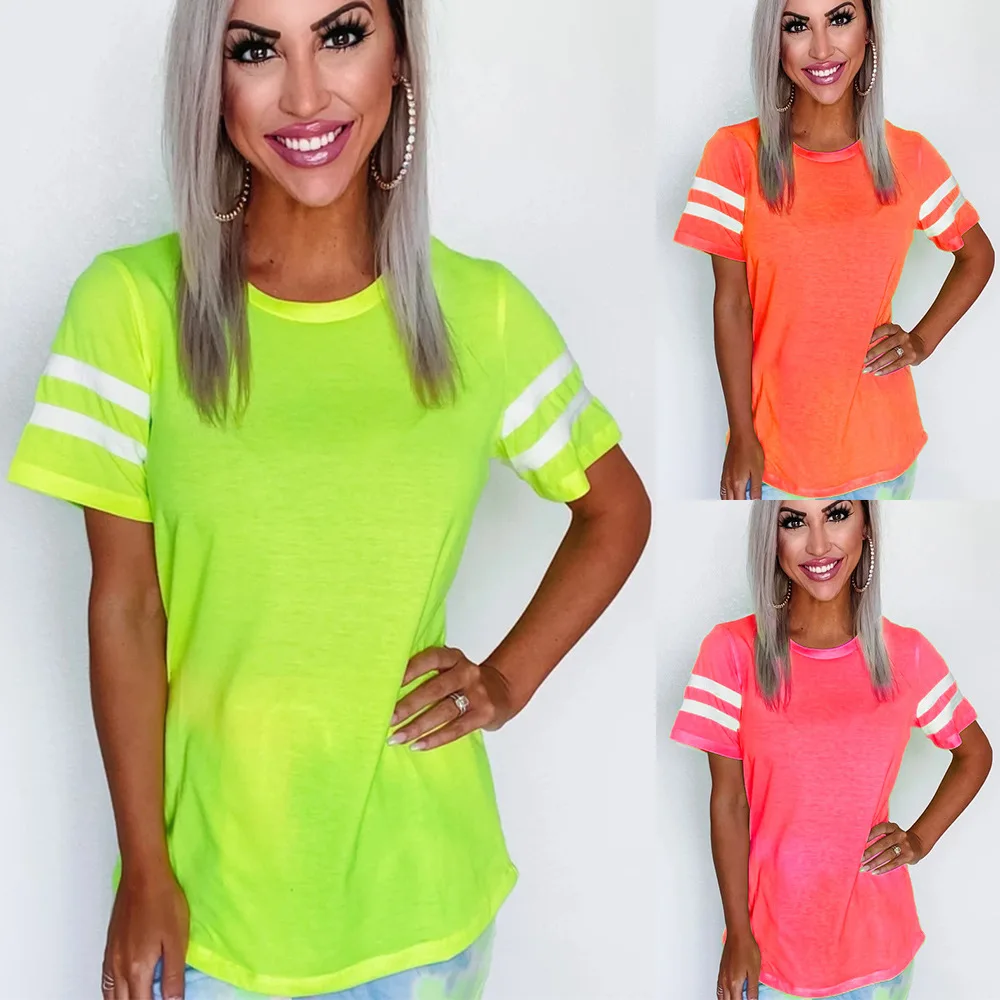 Футболка женская с круглым вырезом, неоновый Повседневный универсальный топ с круглым вырезом, флуоресцентная зеленая спортивная одежда в стиле пэчворк, розовый цвет