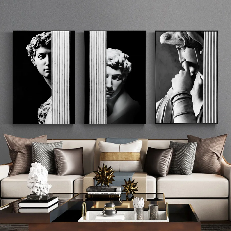 Черно-белая скульптура человека, леди, художественные плакаты и при...