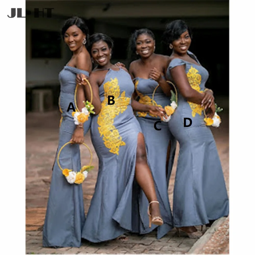 2021 темно-серого и черного цветов, женская обувь Свадебная вечеринка платье с боковыми эластичный атлас платье подружки невесты из Африканской ткани длинное платье подружки невесты, бальные платья
