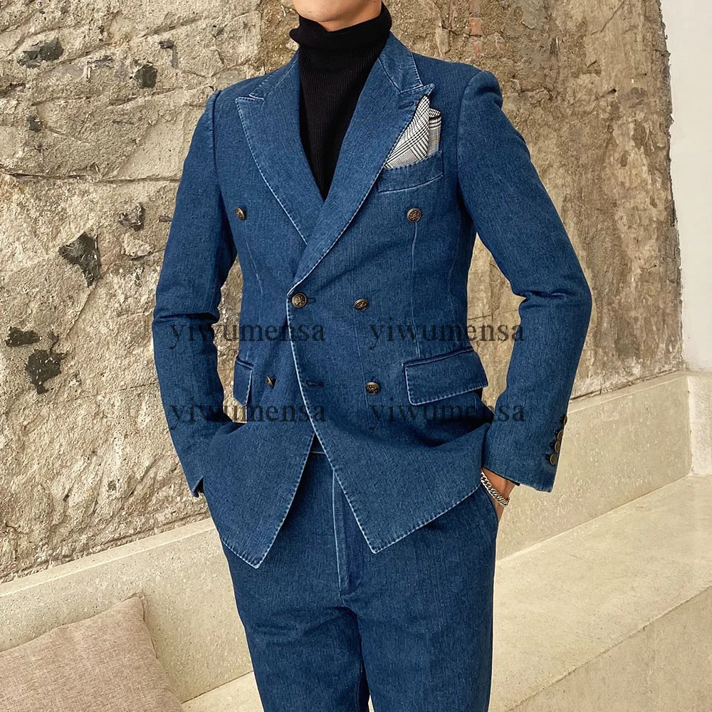 Мужской пиджак и брюки Best Man, синий джинсовый блейзер с лацканами, смокинг, двубортный пиджак, мужские свадебные костюмы из 2 предметов на заказ