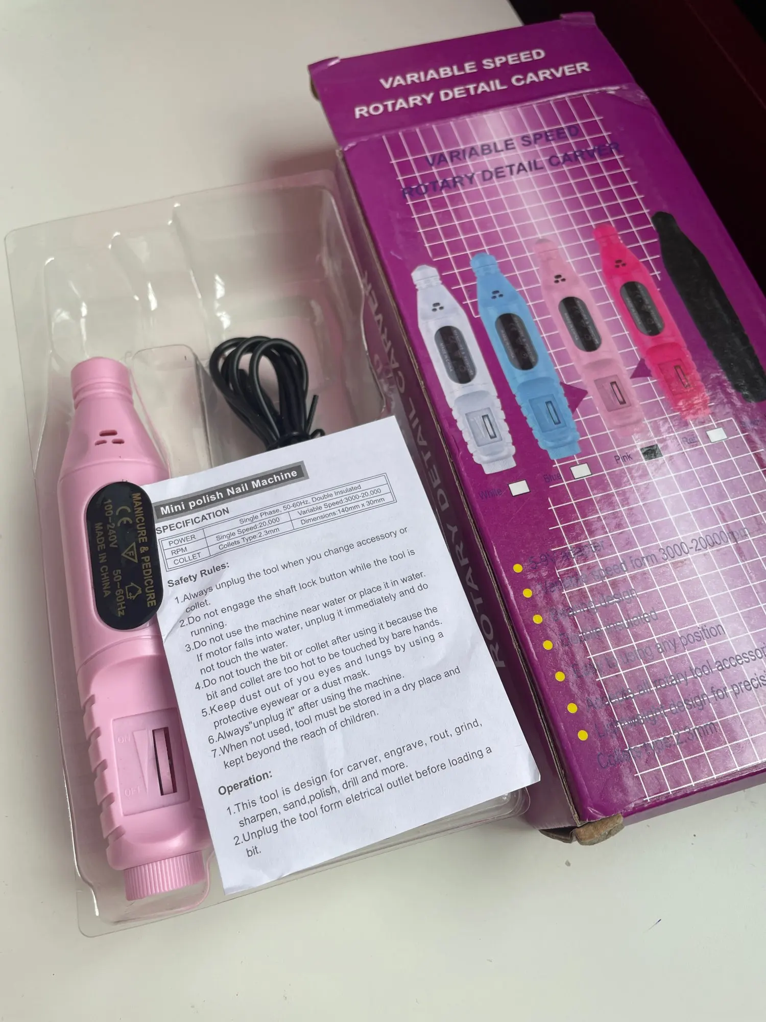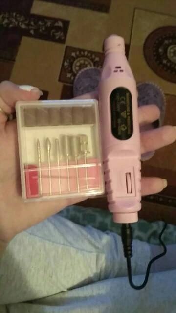 Работает отлично, купила для подпиливания кутикулы. Коробка помята, но это не испортило сам аппарат.