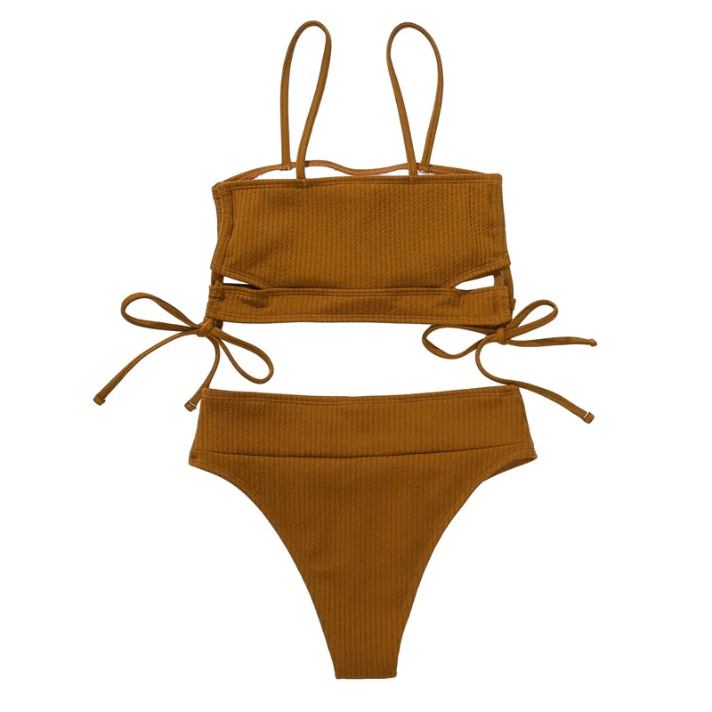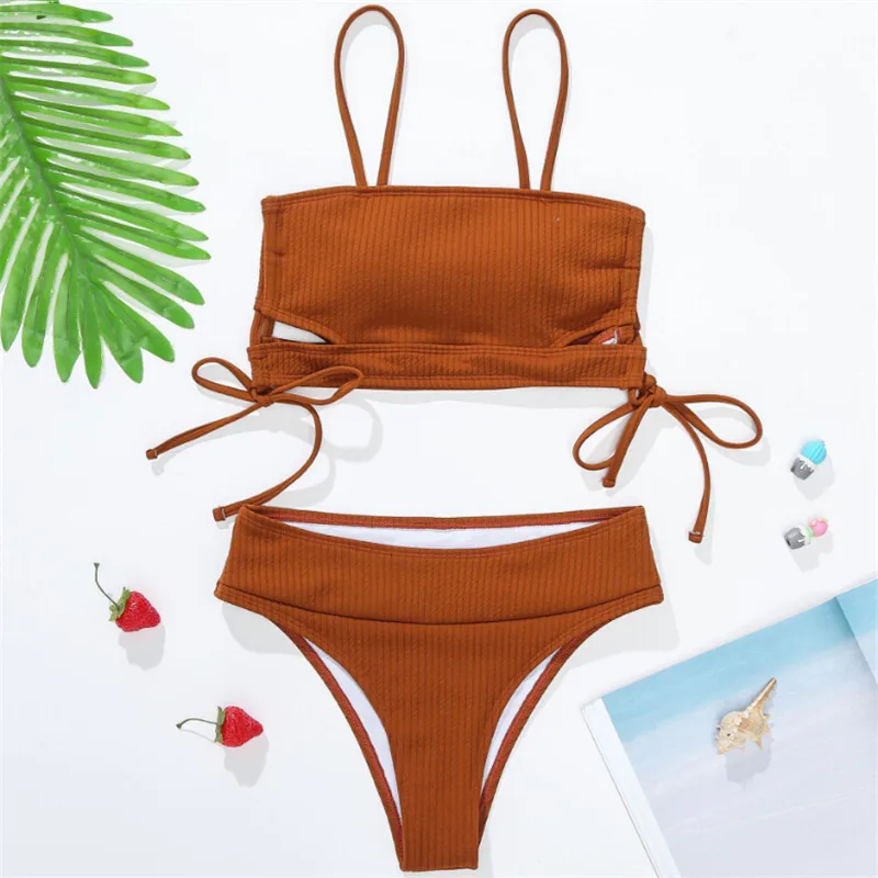 Для женщин коричневый Бикини 2021 Вязание Разделение купальник с низким вырезом на спине платье на бретельках бюстгальтер Высокая талия купальники для Для женщин вечерние летние бикини набор