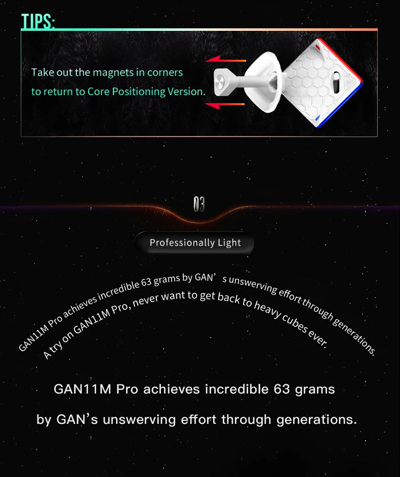 * Цвет: матовый/матовый черный/с УФ-покрытием/мягкий без наклеек* Материал: АБС-пластик* Уровень: 3x3x3* Вес: Всего 63 г* Размер куба: 5,6*5,6*5,6 см* Содержимое упаковки: Gan11m pro Cube * 1, коробка * 1, сумка Gan * 1, учебник * 1,