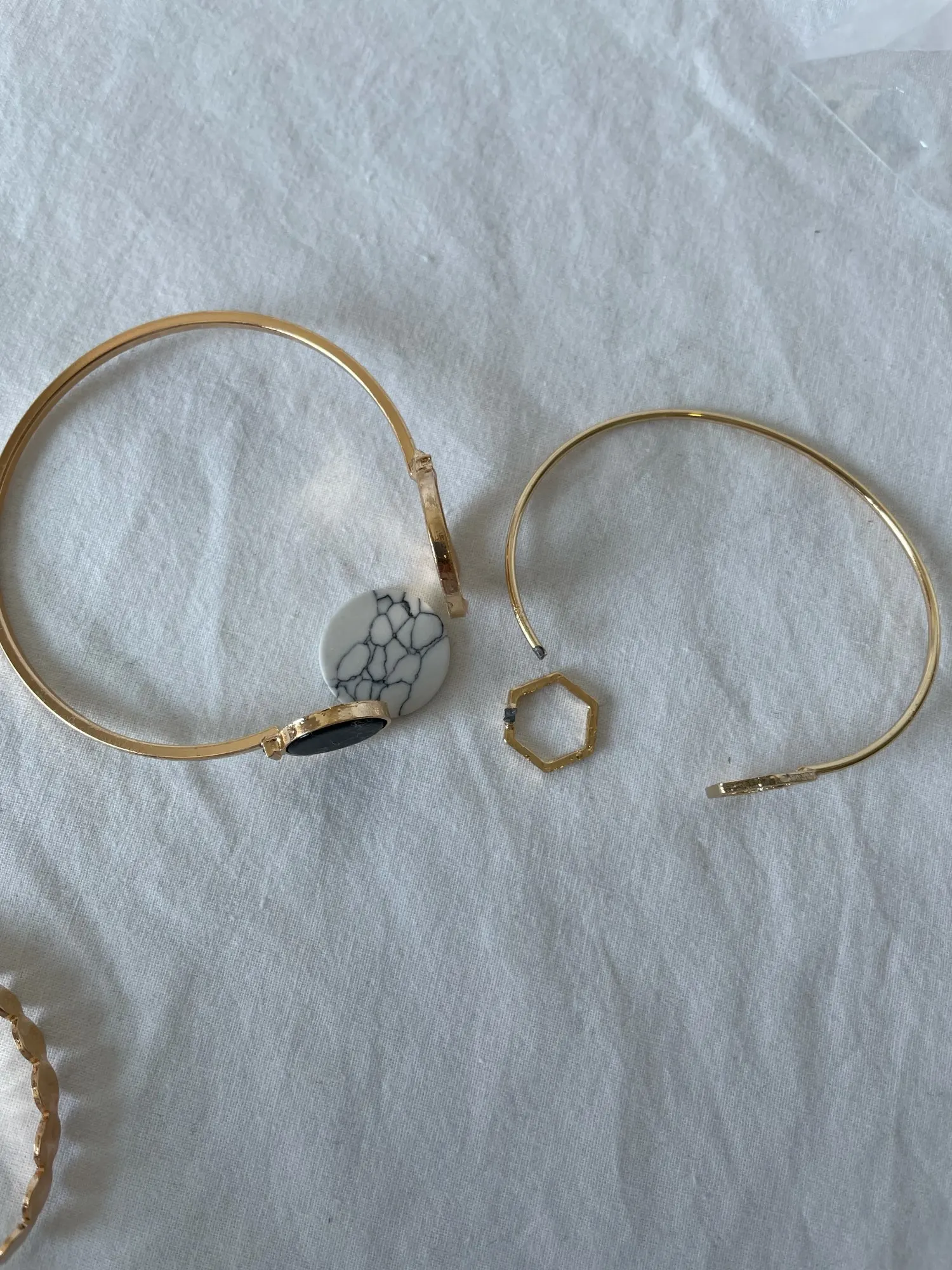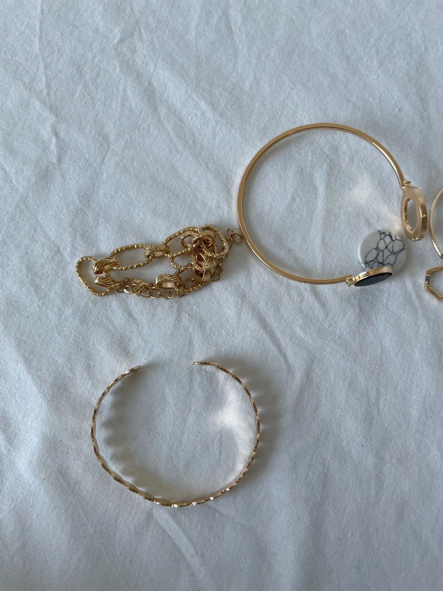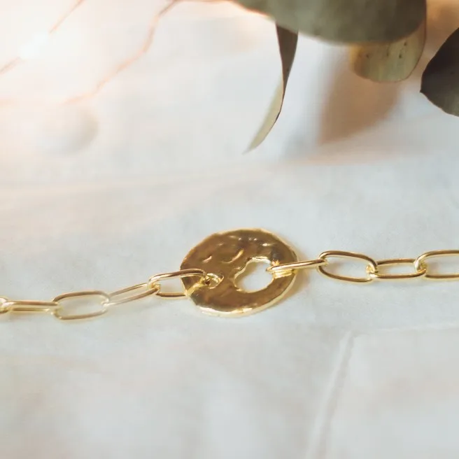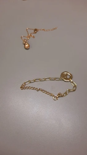 Стильный браслет без излишеств в цвете жёлтого золота. Состоит из цепочек, прикрепленных к круглому медальону. Украшение смотрится очень аккуратно, длина регулируется цепочкой и застегивается на карабинчик. Медальон с ассисетричными отверстиями и выемками. Материал: сплав металлов. Зазубрин и дефектов нет. Браслет мне понравился, подойдёт на узкое запястье. К покупке рекомендую