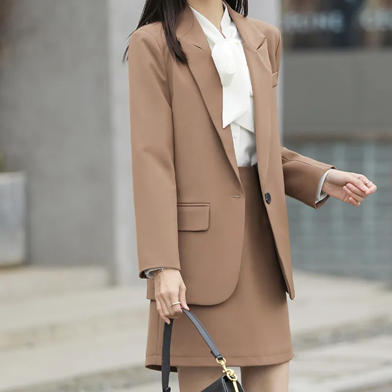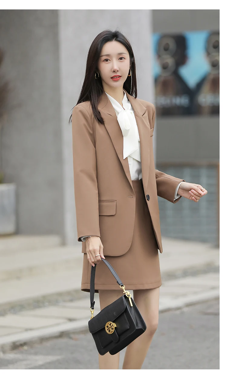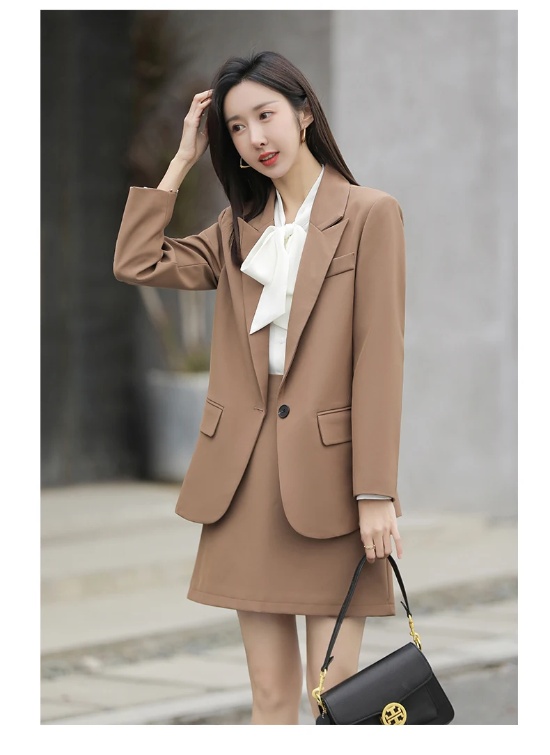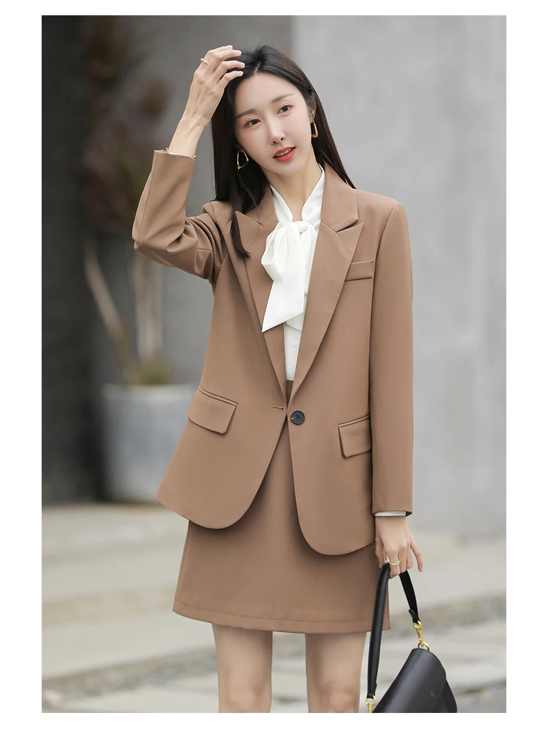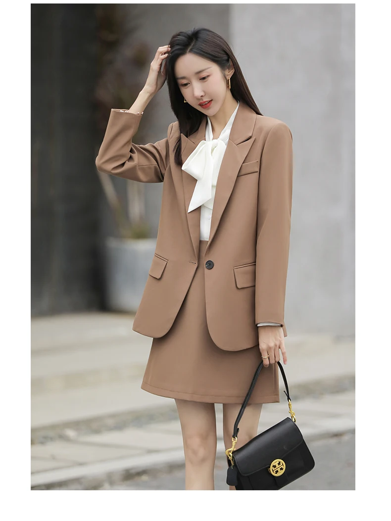 Женский офисный однотонный костюм из 2 предметов, Блейзер, юбка, куртка на одной пуговице, юбка миди, верхняя одежда на весну и осень