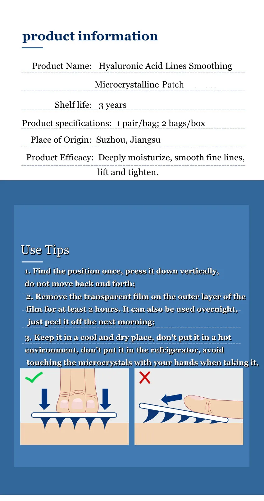 Название продукта: микро-игла гиалуроновой кислоты носогубная маскаОбъем: 2 пар/упак., 3 упаковки, всего 6 парТип кожи: подходит для всех типов кожи