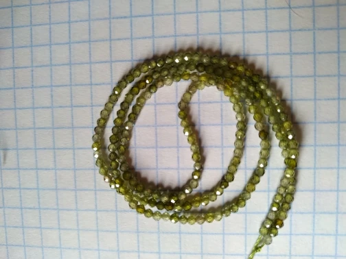 2мм. Бусины матовые, блестят очень скудно, даже не смотря на грани. Много сколов и трещин, (думаю из-за размера), около 20 штук не пригодны для использования. Бисер совсем не из дешевых, поэтому расстроилась. Все-таки 2мм не самый хороший выбор.