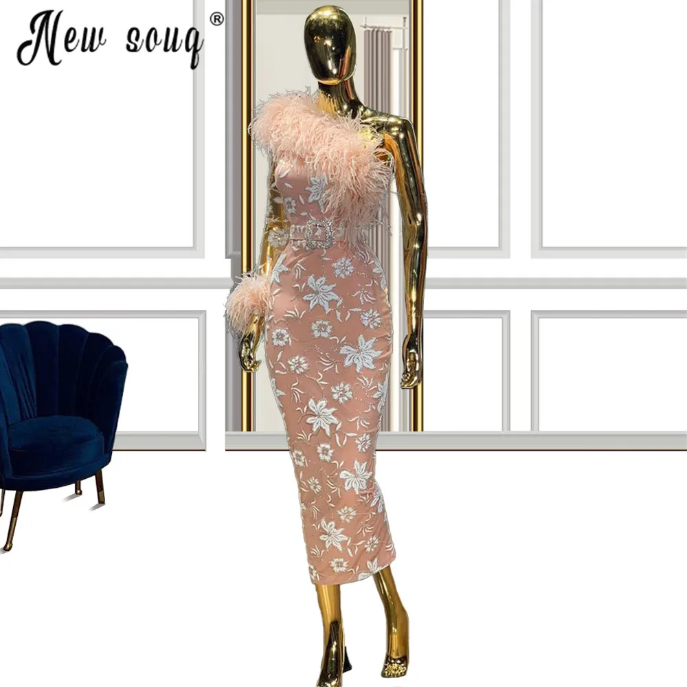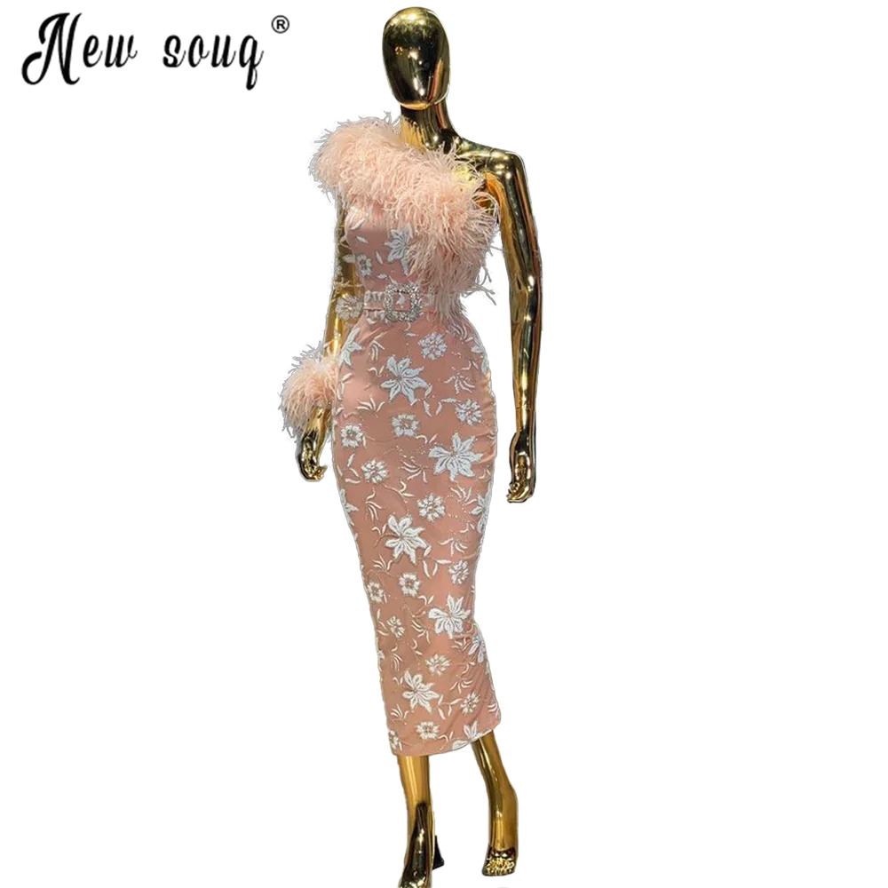 Вечерние платья цвета шампанского на одно плечо с перьями, женские вечерние платья русалки, платья знаменитостей в Дубае с цветами, выпускное платье