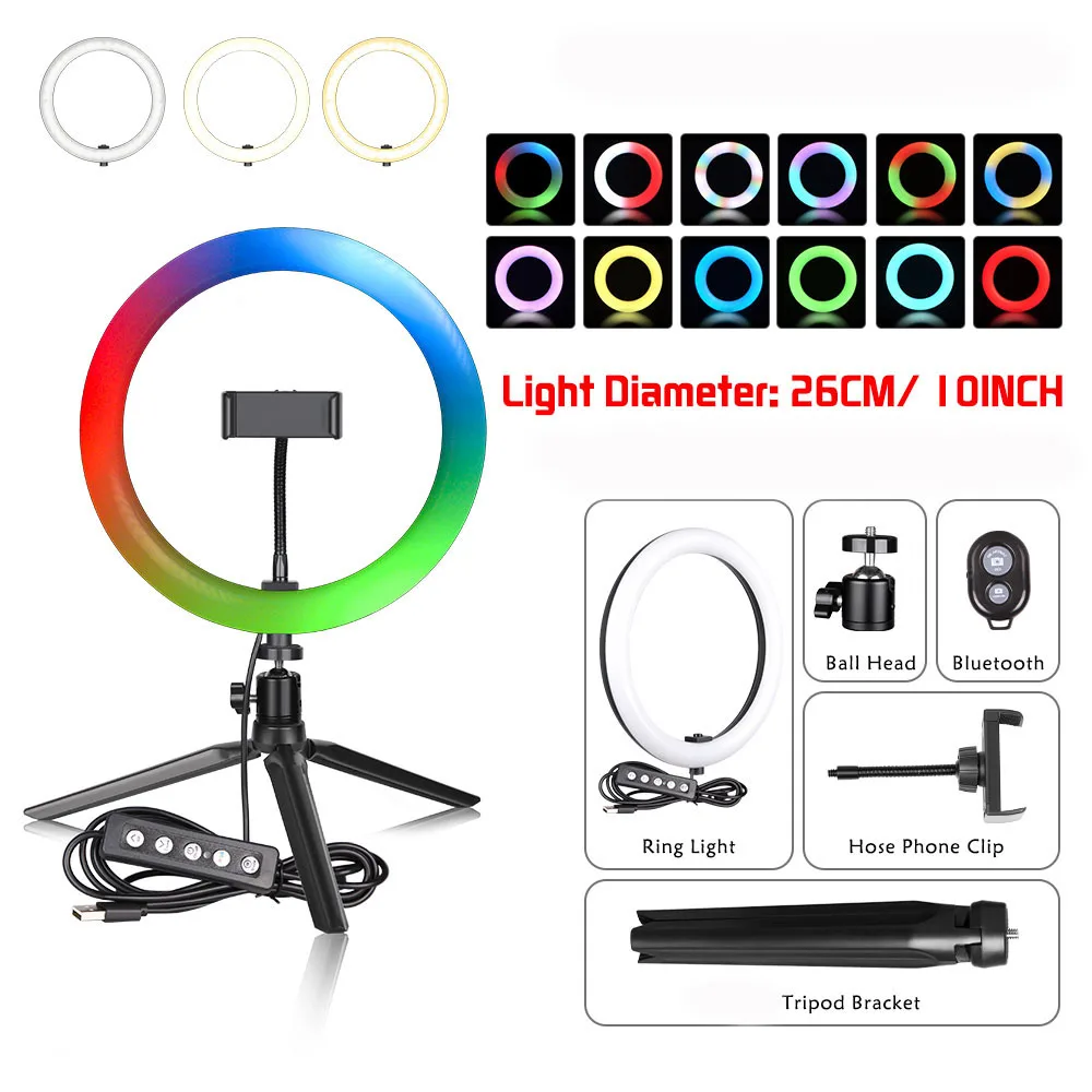 Кольцевой светильник для селфи, светодиодный светильник с регулируемой яркостью, 15 цветов, со штативом, подходит для нанесения макияжа и прямых трансляций