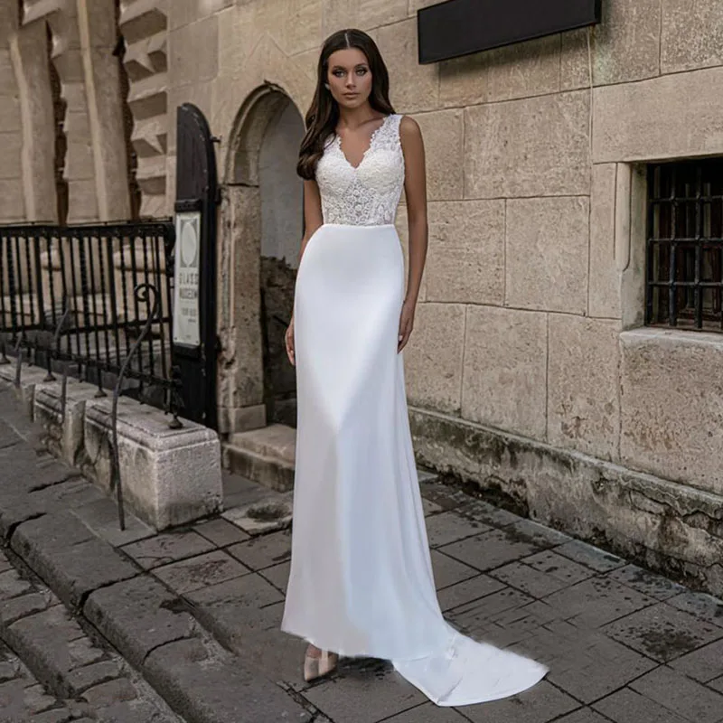 Женское атласное платье-Русалка с V-образным вырезом и длинным шлейфом