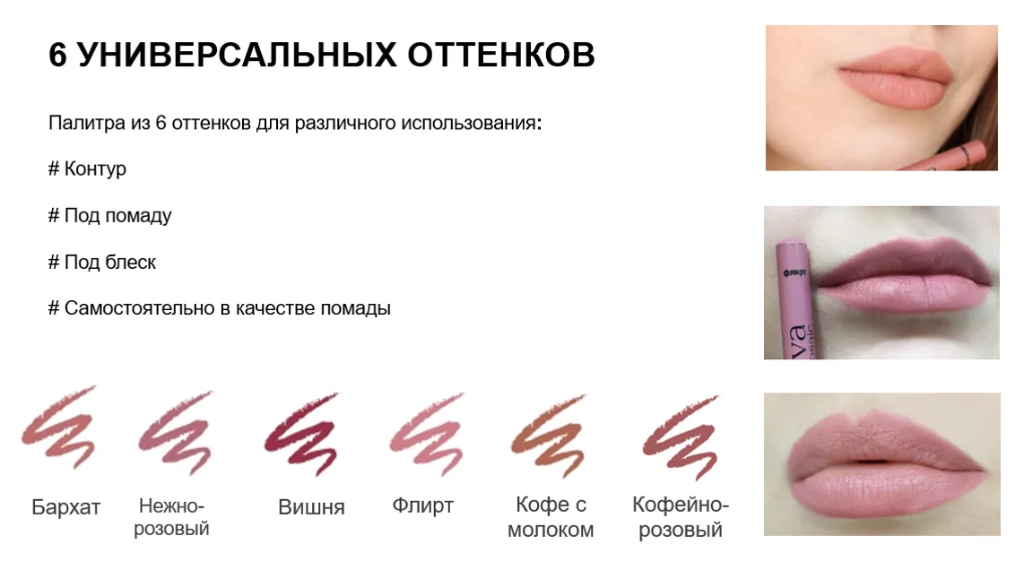 Мягкий карандаш для губ создает четкий контур и подчеркивает цвет помады. - комфортно наносится - содержит воски и питательные вещества для дополнительного ухода - не стирается и не размазывается в течение дня