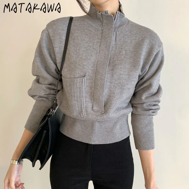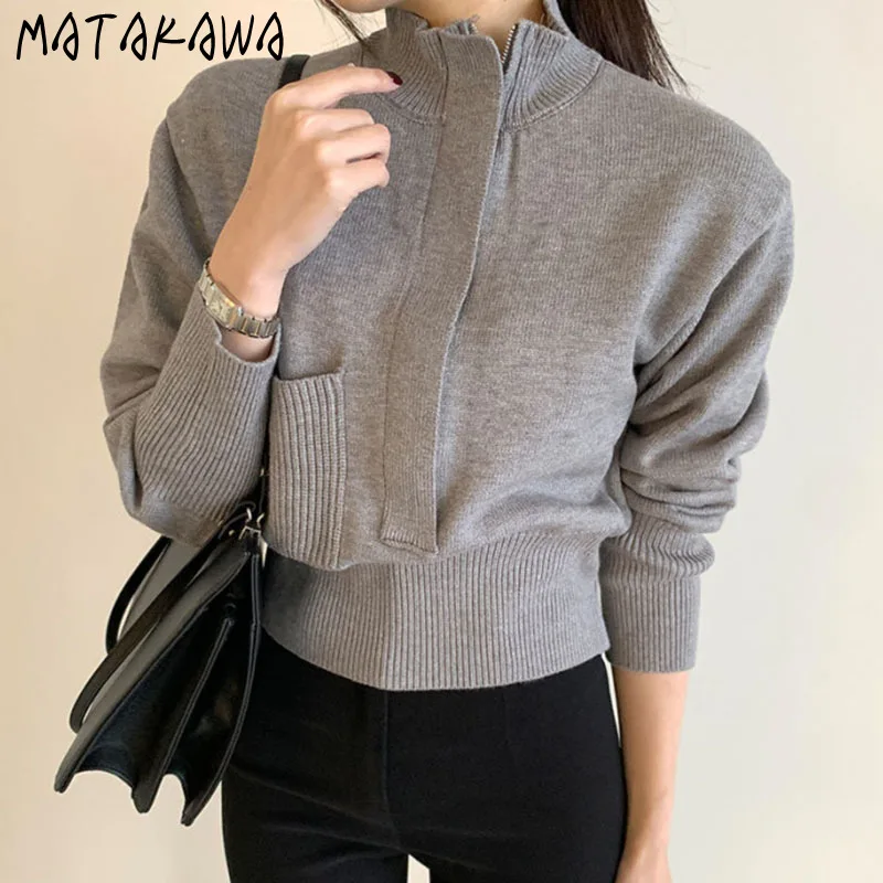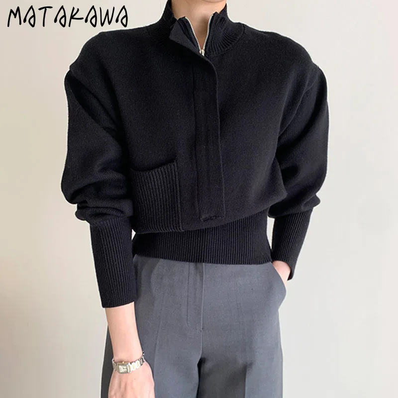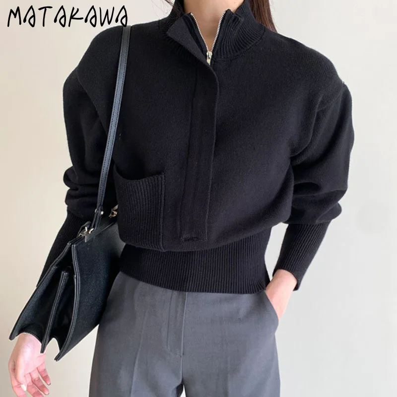 Женский кардиган с воротником-стойкой, повседневный облегающий кардиган в корейском ретро-стиле на молнии с карманами и пышными рукавами, 2022