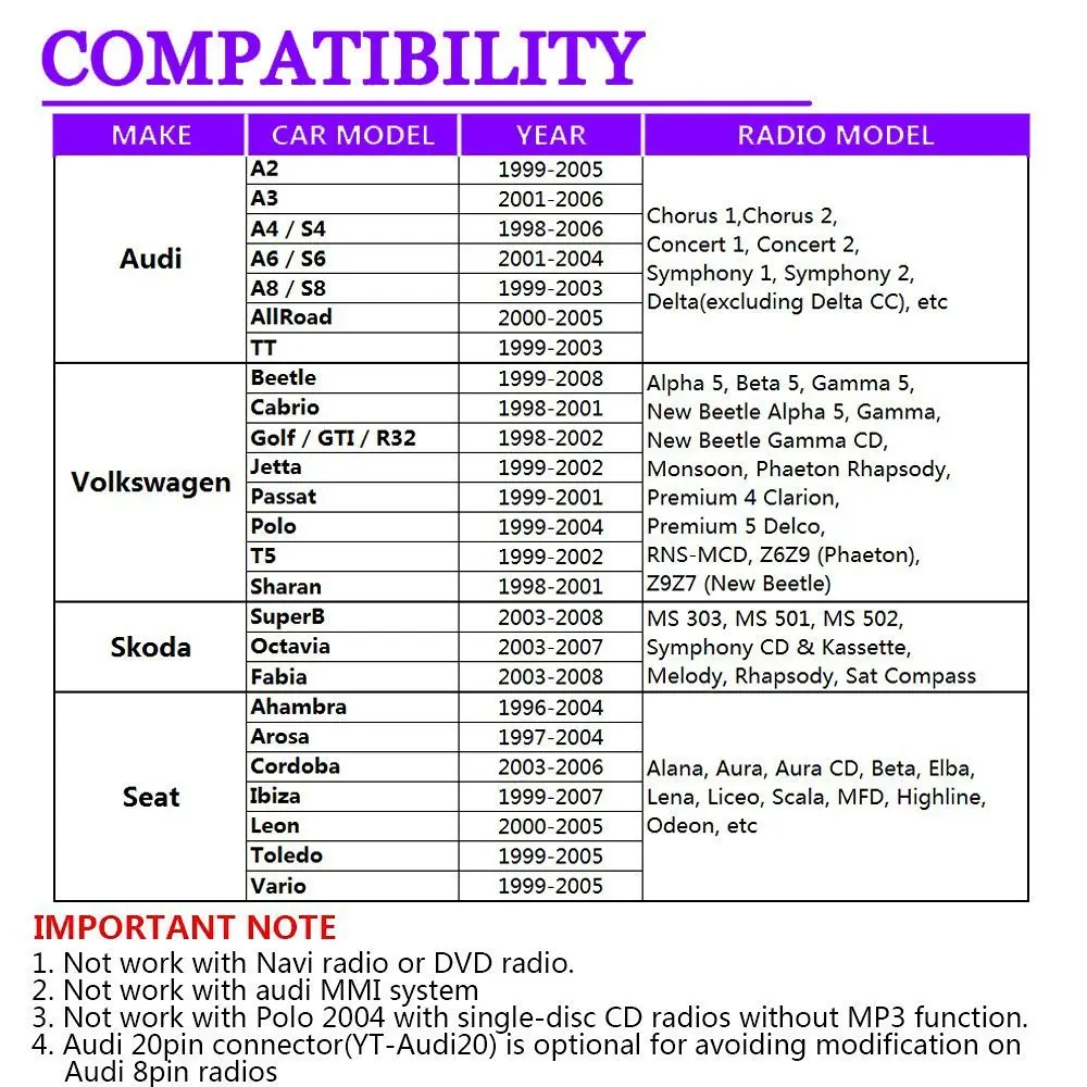 Важное примечание1. Не работает сРадио NaviИлиРадио DVD.2. Не работает с системой audi MMI3. Не работает с Polo 2004 с однодисковыми CD-радио без функции MP3.4. Разъем Audi 20 Pin является необязательным для избежания модификации на радиоприемниках Audi 8 pin.