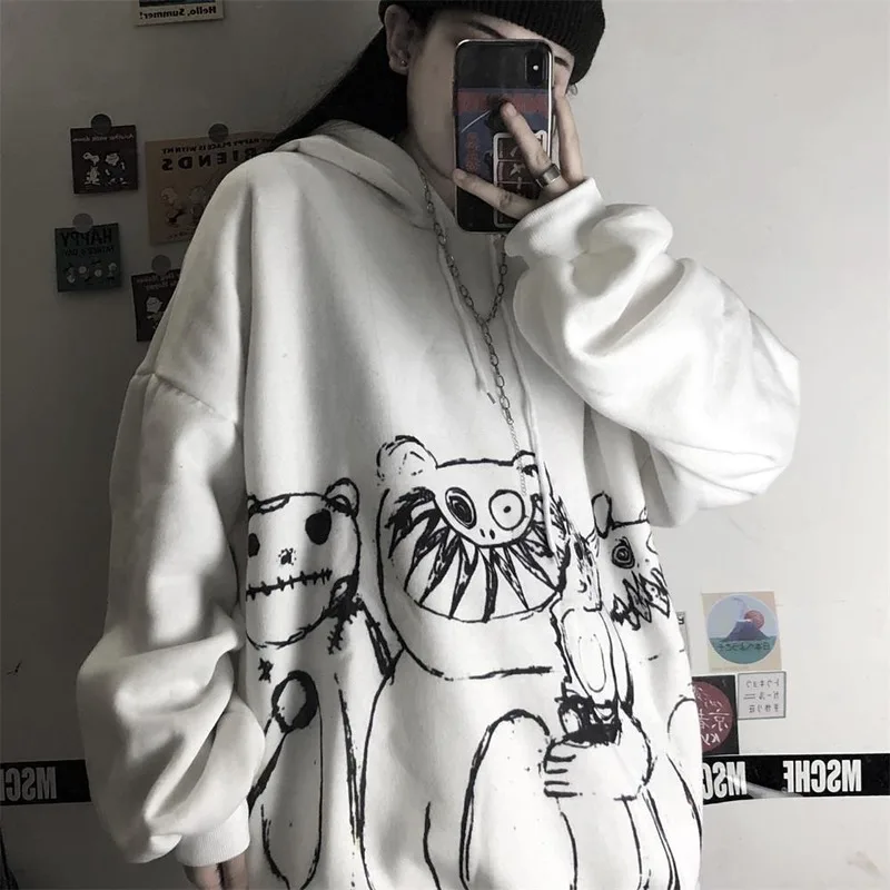 Женская толстовка с капюшоном QWEEK, в стиле панк, аниме, большого размера, с мультяшным принтом, гот, Харадзюку, уличная одежда для женщин, худи граффити