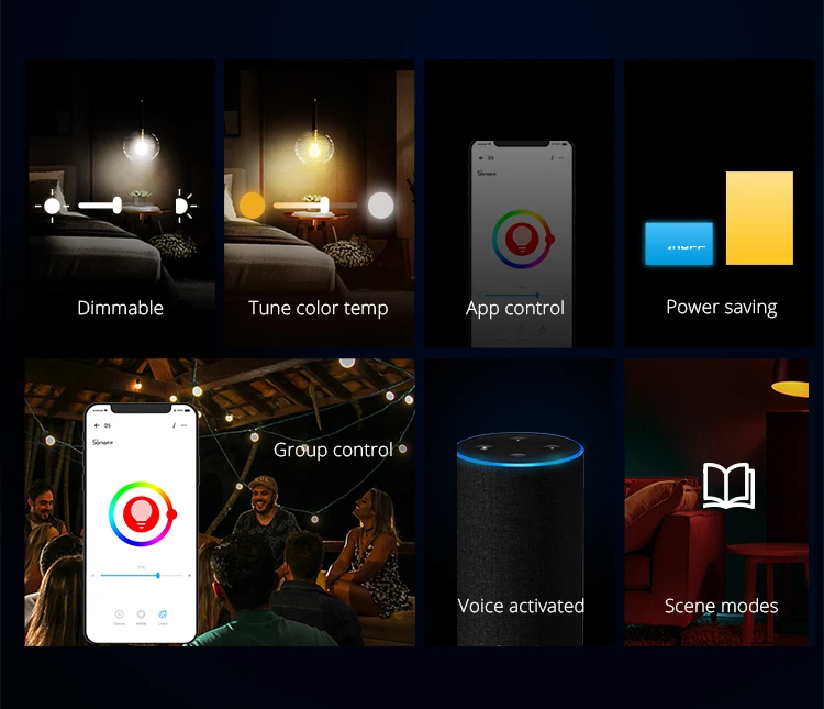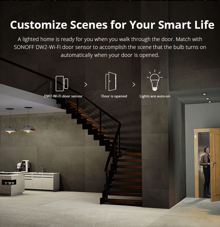 Светодиодный смарт-лампочка SONOFF Wi-FiУмные светодиодный лампы еще умнее в домашней автоматизации, и они довольно просты в использовании. Просто вкрутите умную лампу в лампу, соедините ее со своим смартфоном, и вы больше не будете вставать с кровати, чтобы ударить светильник-переключатель. Светодиодный смарт-лампочка SONOFF также поддерживает Автоматический триггер, который автоматически включается или выключается, когда вы нажимаете на дверь, просто подключите датчик SONOFF DW2-Wi-Fi к двери.Даже вы можете установить лампу, чтобы включить или выключить дверь с датчиком SONOFF DW2-Wi-Fi двери. Светодиодный смарт-лампочка SONOFF позволяет вам тускнеть и настроиться на разную цветовую температуру через скольжение панели в приложении. Он имеет широкий диапазон яркости от 2700K до 6500K, который достаточно яркий для почти любого пространства для использования. Работает с третьей вечерние умных помощников из поставляется через поддержка Alexa и Google Home, так что вы можете контролировать лампочку, регулировки яркости и цвета, используя ваш голос. Умная лампа 7 Вт может производить 60 ВАТТ эквивалент 806 люмен, чтобы снизить на электроэнергию значительно. Кроме того, он был надежным с расписанием времени, что делает лампу автоматически включаться и выключаться в установленное время дня. Лампочка также поставляется с восемью дополнительными заданными режимами сцены, которые позволяют мгновенно получить доступ к окружающей среде, которую вы хотите повысить. Если вы получите множество SONOFF умный светодиодный ламп, группа-функция управления-это очень удобно для вас, чтобы включать и выключать вместе, настройте всю цветовую температуру и яркость на один и тот же уровень, нажав на приложение.Если вам нужно больше цветов в вашем пространстве, подумайте о B05-B-A60 умной светодиодной лампе RGB; Если нужны Двойные Цвета, B02-B-A60-хороший выбор.