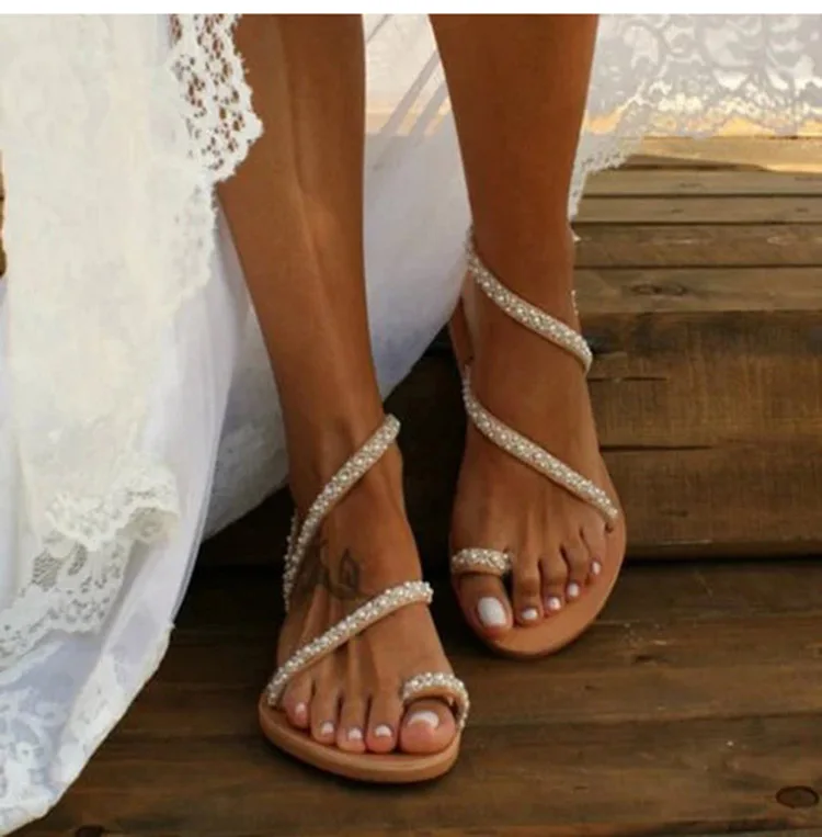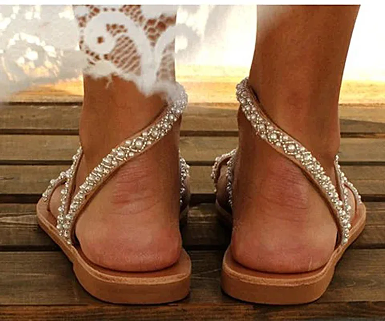 Женская обувь; Модные пляжные женские повседневные сандалии; Женские сандалии на плоской подошве с кристаллами и жемчугом; Удобная женская обувь в богемном стиле ретро