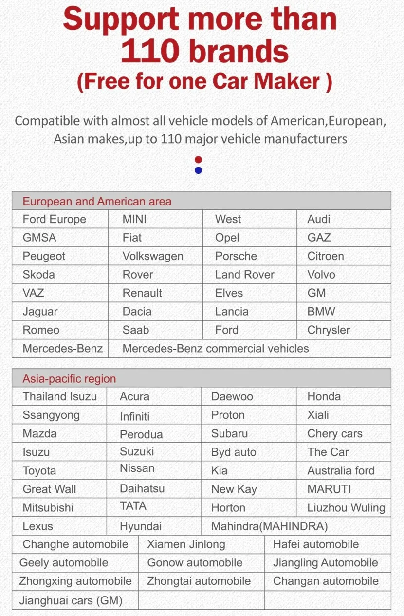 ThinkCar Pro: вы можете выбрать любые пять брендов автомобилей бесплатно в течение одного года Thinkdriver: только 3 вина (автомобиль) бесплатно один год AP200: только один автомобильный бренд бесплатно один год Thinkdiag: только один автомобильный бренд бесплатно один год Для OBD2 функции: срок службы бесплатно для всех транспортных средств после 1996 года Для полной диагностики системы: пять автомобильных брендов бесплатно, другие автомобильные бренды $19,95 каждый Для сброса Специальная функция: $19,95 каждый