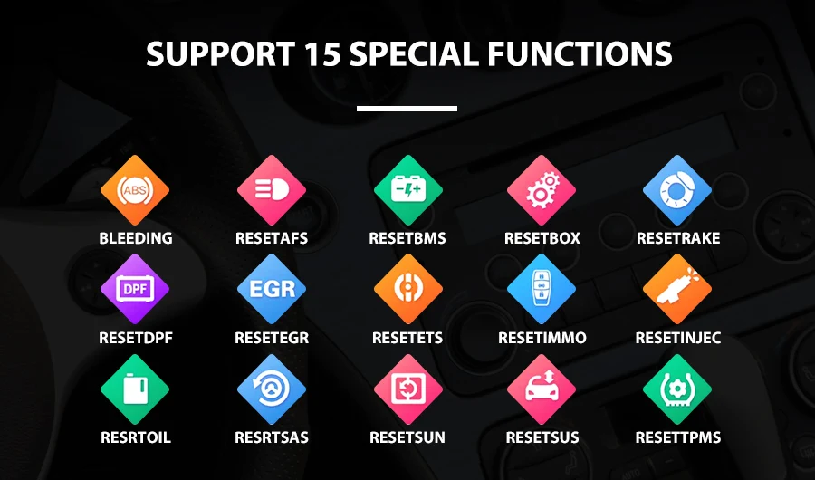 1. Обслуживание сброса масляной лампы: позволяет сбросить для нового расчета системы жизнедеятельности моторного масла после изменения масла. 2. Обслуживание EPB: важно в обслуживании безопасности и эффективности электронной тормозной системы. 3. Батарея летучей мыши: позволяет сканировать инструмент для оценки состояния заряда батареи, контролировать ток замыкания, зарегистрировать замену батареи и активировать оставшееся состояние транспортного средства. 4. DPF сервис: работает особенно для дизельной системы фильтра частиц с регенерацией DPF, DPF компонент замены обучения и DPF после замены блока управления двигателем. 5. Обслуживание SAS: помогает очистить напоминания об ошибке датчика угла поворота руля и играет важную роль в калибровке датчика угла руля. 6. Обслуживание TPMS: имеет смысл отображать идентификаторы датчиков из ECU транспортного средства, входя в контрольные и контрольные датчики TPMS. 7. Программирование ключей IMMO: уникальная функция программирования автомобильных ключей и считывания ПИН-кода, это в основном деактивирует ключ утерянного транспортного средства и программирует Новый сменный ключ fob. 8. ABS кровотечение: ABS тормозное кровотечение, чтобы получить твердую тормозную колодку После истощения воздуха после ремонта ABS насосной системы 9. Сброс солнечной крыши: память солнечной крыши, как правило, необходимо сбросить, когда батарея транспортного средства заменена или машина умирает 10. Сброс подвески: попробуйте сбросить электронную подвеску с системой массажа, закройте все двери koyo, переверните систему сообщений, перейдите в режим сброса или выключения подвески 11. Сброс передач: Процедура сброса передачи Адаптивное обучение DIY. Запустите машину и прикрепите. Как только вы выполните эти процедуры, блок управления двигателем (ECU) и блок управления передачей (TCU) работают вместе, чтобы узнать, как вы можете управлять автомобилем, отслеживая ваш шаблон вождения. После того, как вы выполните этот метод программирования TCU / ECU, Управляйте автомобилем. 12. Сброс фары AFS: «AFS» означает адаптивную систему переднего освещения (в ночное время с би-ксеноновыми фарами) Он поворачивается с обеих сторон, Нажатие этой кнопки означает, что вы не указываете направо вперед и не поворачиваете, когда поворачиваете руль 13. Кодирование инжектора: утечки инжекторов и некоторые мертвые инжекторы могут быть пропущены, даже если инжектор отключен. Другие проблемы с системой зажигания и механическими компонентами также могут не показывать потерю оборотов в минуту при выключении инжектора 14. Регулировка дроссельной заслонки: корпус дроссельной заслонки-это трубка с поворотным плоским клапаном (бабочка), используемая для контроля количества воздуха, входящего в двигатель. В автомобиле с электронным топливом Датчик положения дроссельной заслонки и датчик воздушного потока связываются с компьютером, который обеспечивает необходимое количество топлива, необходимого для инжекторов. Необходимо повторно изучить положение газового датчика после стирания или ремонта 15. Передача обучения: инструмент сканирования контролирует определенные датчики положения распределительного вала, чтобы определить, когда все условия выполнены, чтобы продолжить процесс работы двигателя