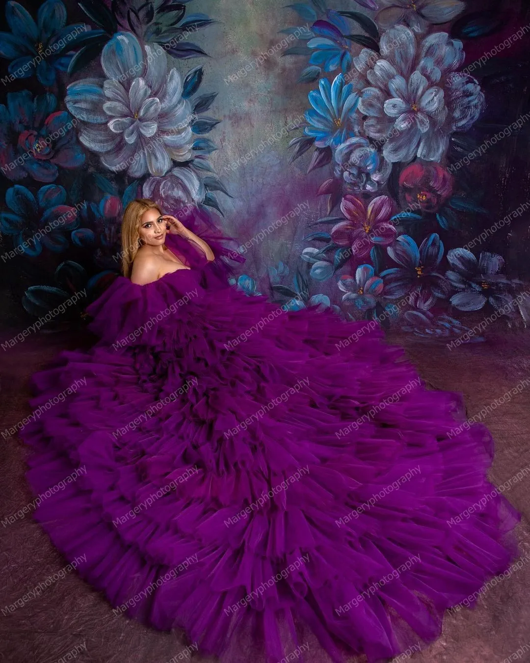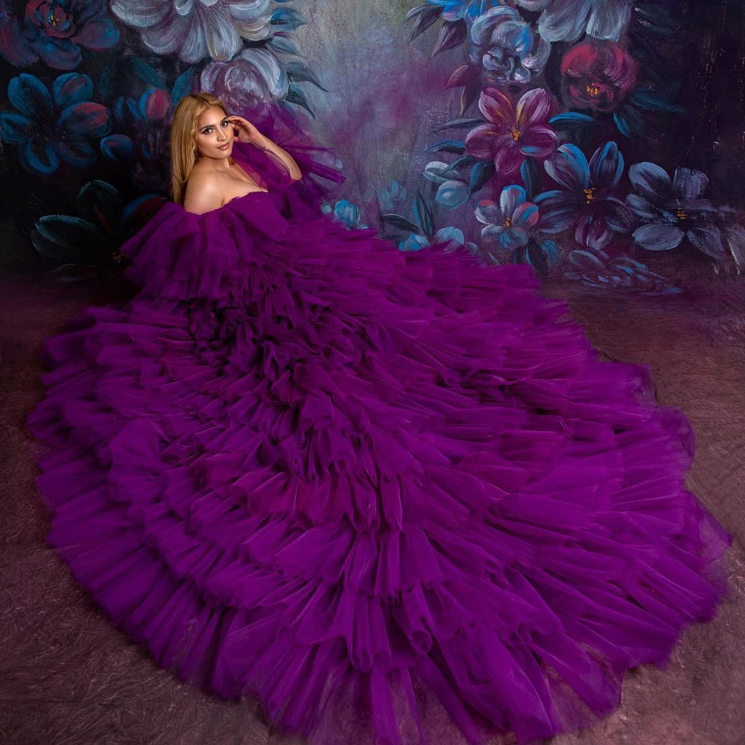 Роскошные пышные фиолетовые длинные платья из тюля в несколько рядов для беременных женщин для фотосессии красивая одежда для беременных без бретелек с длинными оборками