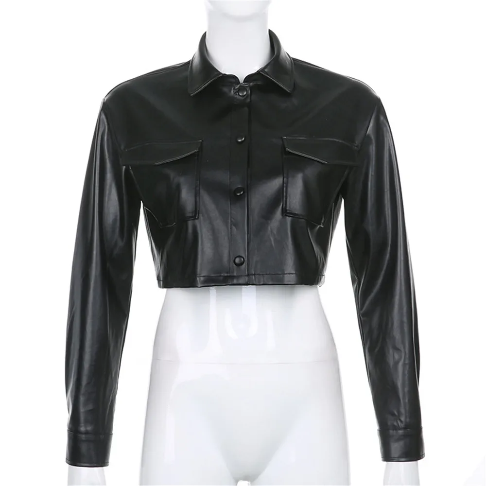 Куртка женская кожаная с длинным рукавом, модная повседневная верхняя одежда с воротником и карманами, на пуговицах, уличная одежда, черная белая, весна-осень