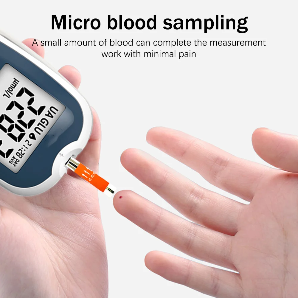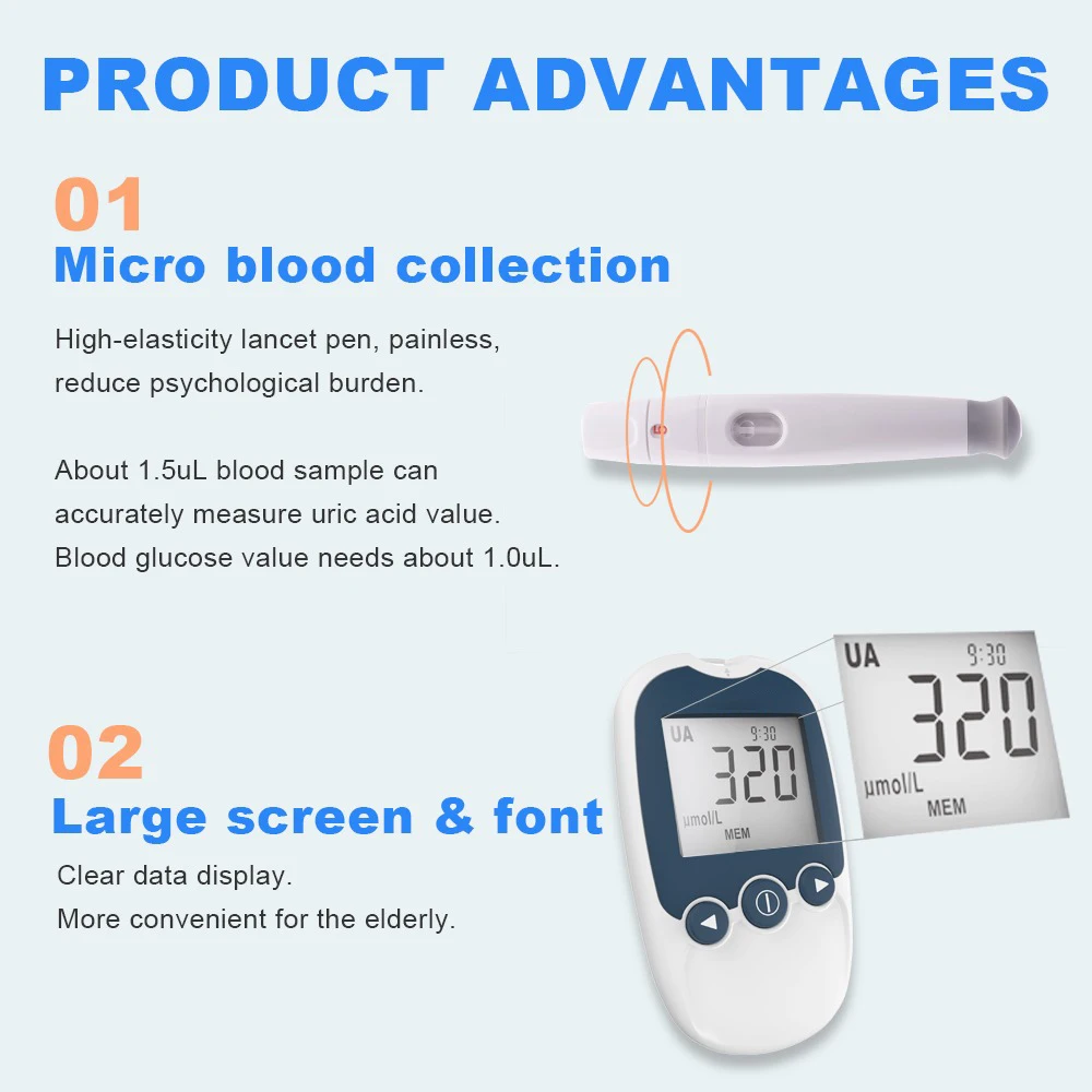 1. Ручка-ланцет с высокой эластичностью для сбора микрокрови, безболезненная, снижающая физическую нагрузку. Около 1. 5uL образец крови может точно измерить значение мочевой кислоты. Значение глюкозы в крови необходимо около 1 .0uL2. Большой экран и четкий дисплей данных. Более удобный для пожилых людей.