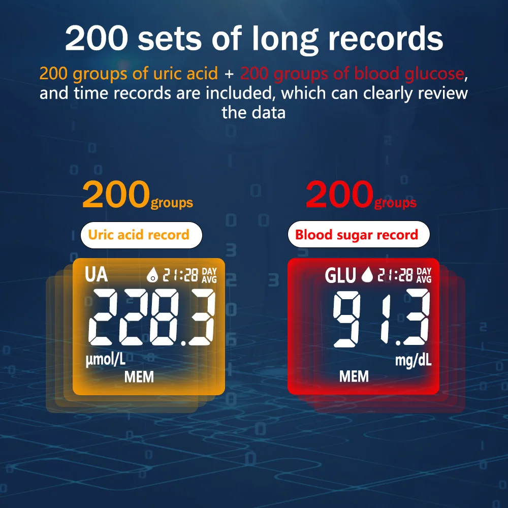200 групп мочевой кислоты + 200 групп глюкозы в крови, и данные о времени включены, которые могут четко просматривать данные