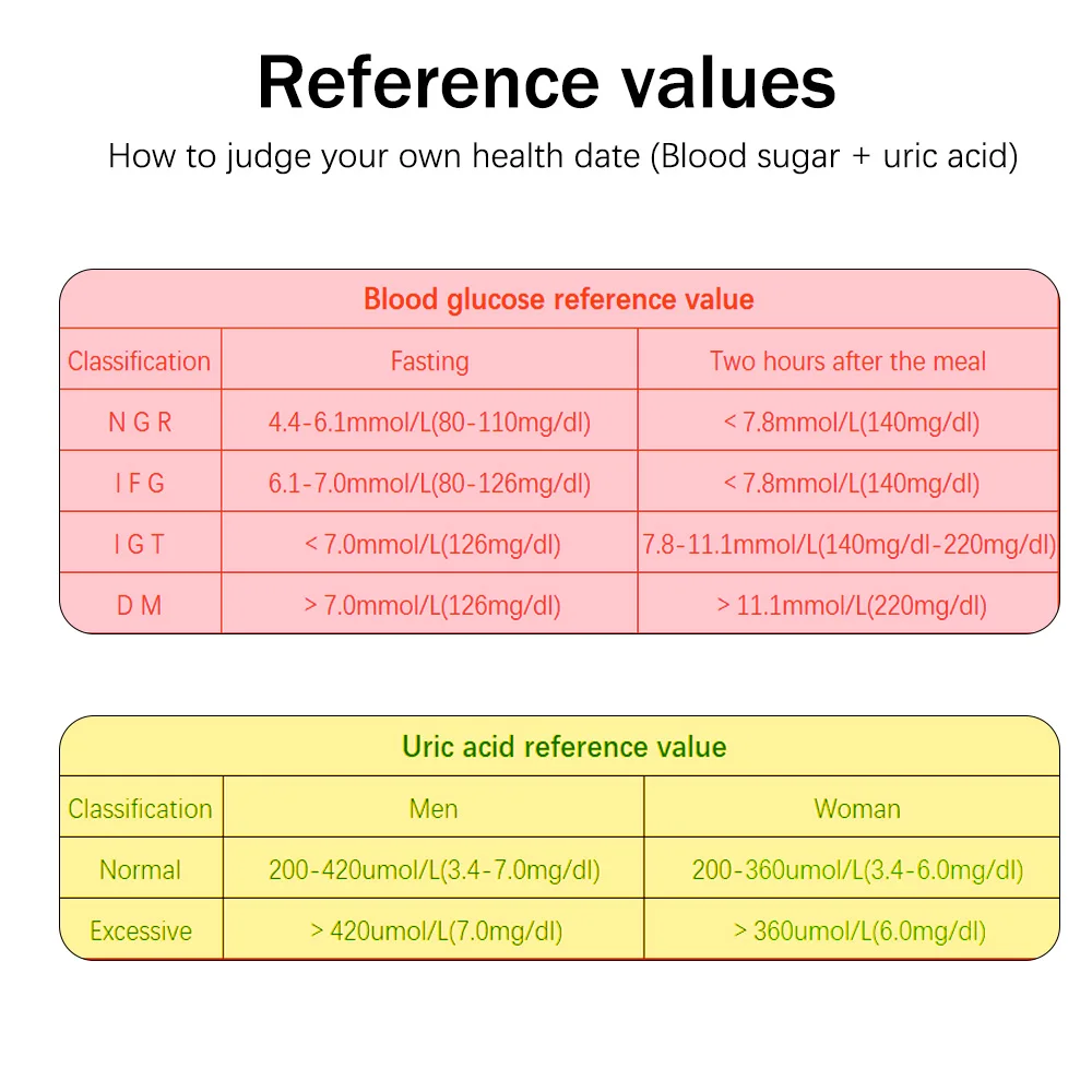 Вопрос: нужен ли мне пустой желудок для измерения мочевой кислоты?Ответ: рекомендуется тестировать на пустой желудок, а также избегать употребления алкоголя и продуктов с высоким содержанием пурина, таких как животное и морепродукты за день до этого.В: почему иногда результаты отличаются?Ответ: личностная ценность мочевой кислоты и уровень сахара в крови колеблются в различные сроки, и результаты теста будут зависеть от различных факторов, таких как диета и пищеварение, упражнения, лекарства, образцы крови, время хранения глюкозы в крови, неправильная работа и т. Д. Результаты больничных тестов также зависят от этих факторов, И оба имеют положительные и отрицательные отклонения, поэтому иногда разрыв является явным. Могут быть ошибки в мочевой кислоте/мониторинг уровня глюкозы в крови в следующих ситуациях:1. Большое потребление продуктов пурин перед использованием может повлиять на результаты анализа мочевой кислоты.2. Прежде чем использовать недавно открытую тестовую полосу в первый раз, не вставляя кодовую карту для калибровки, это непосредственно повлияет на результаты измерений.3. Образец крови слишком долго находится в воздухе.4. Начните всасывать кровь в области реакции, когда объем крови недостаточен.5 при использовании область всасывания образца тест-полоски загрязняется касанием пальца.